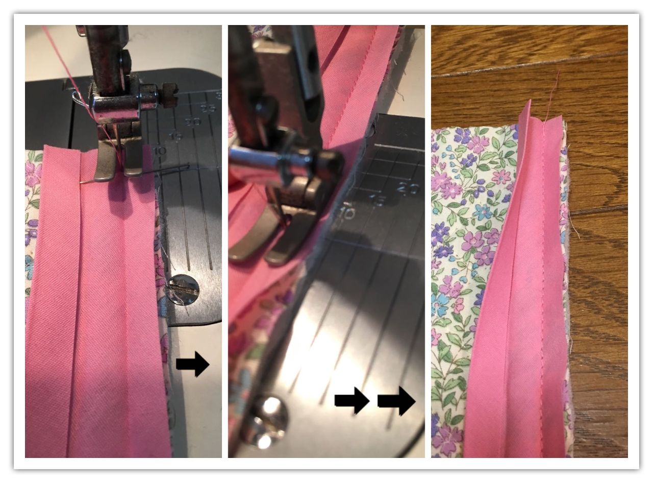 完成形に挟み込んだら縫い代の端をそろえてバイアステープを広げます。そして折り目の上を縫います