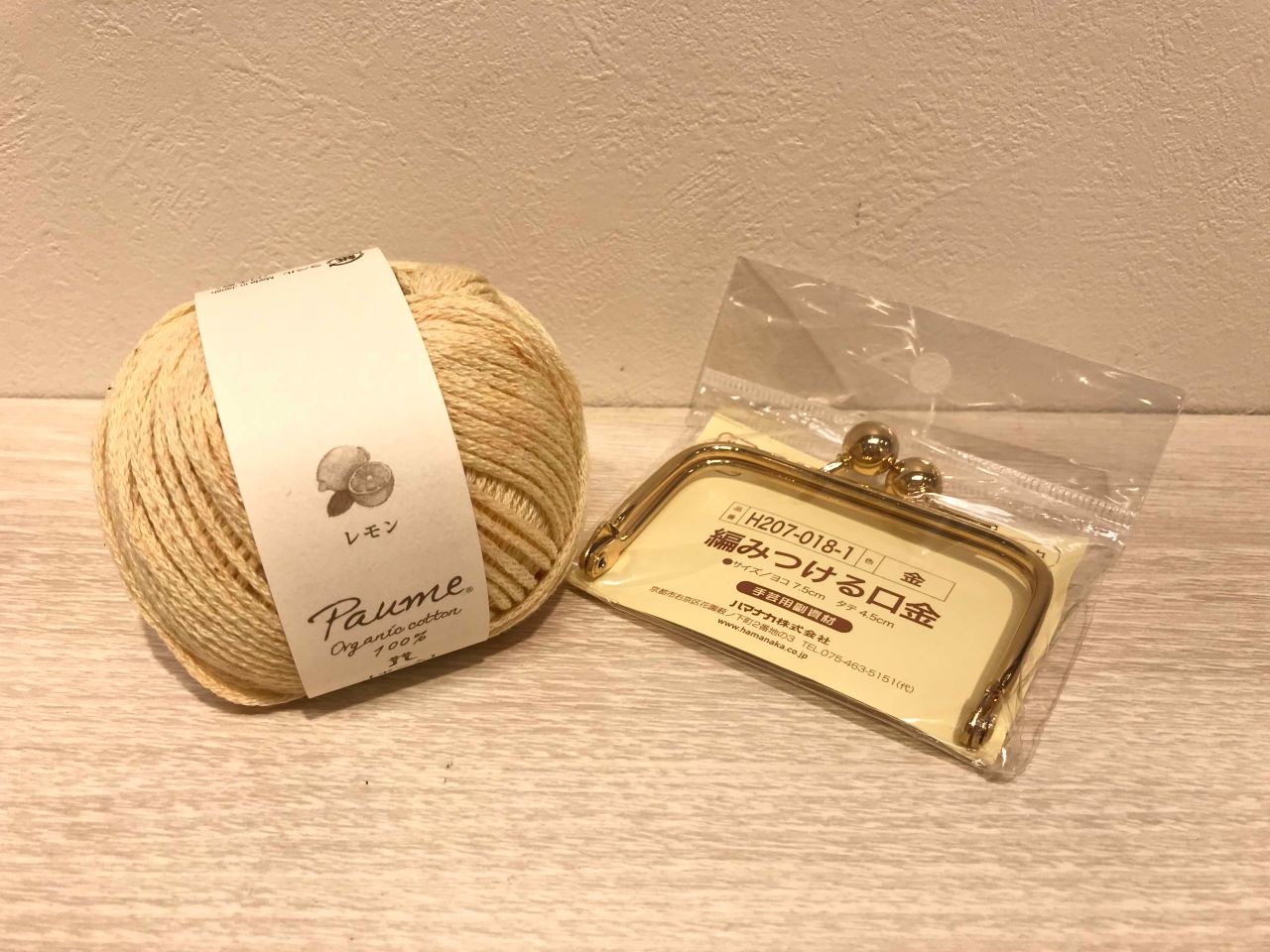 今回は「レモン」「編みつける口金ゴールド」を使用!使用かぎ針は4/0号です。(まつぼっくりは手が緩いので、3/0号を使用しました)
