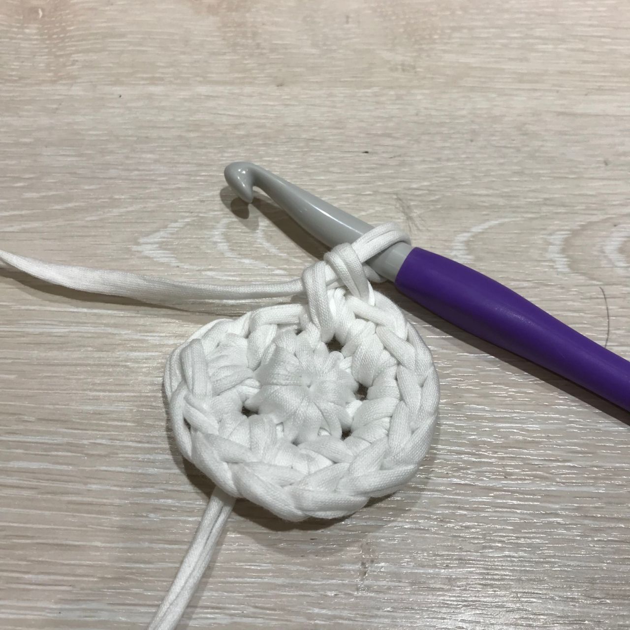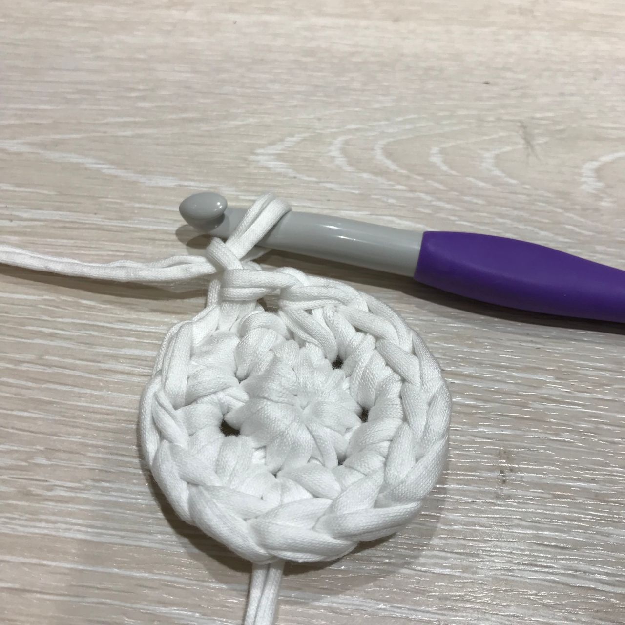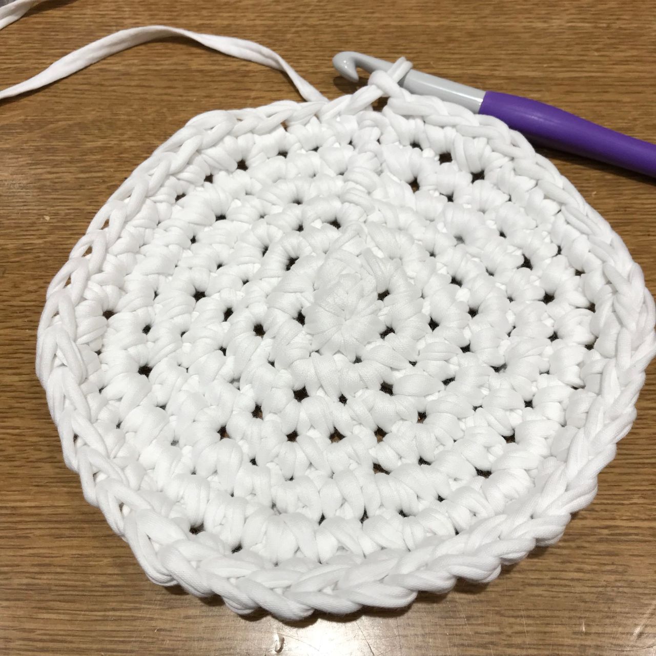 5.1目立ち上げ、3段目から7段目まで同様に、1段につき6目増えるよう細編みをし、42目になるように底を編んでいきます