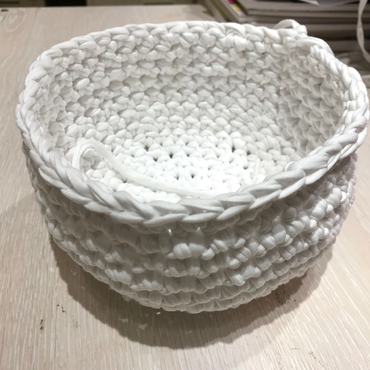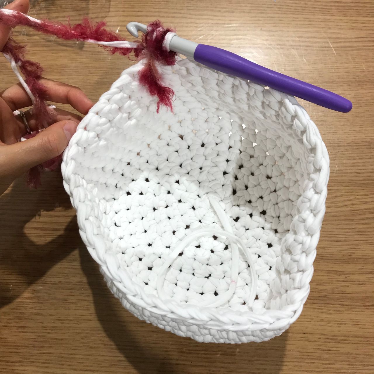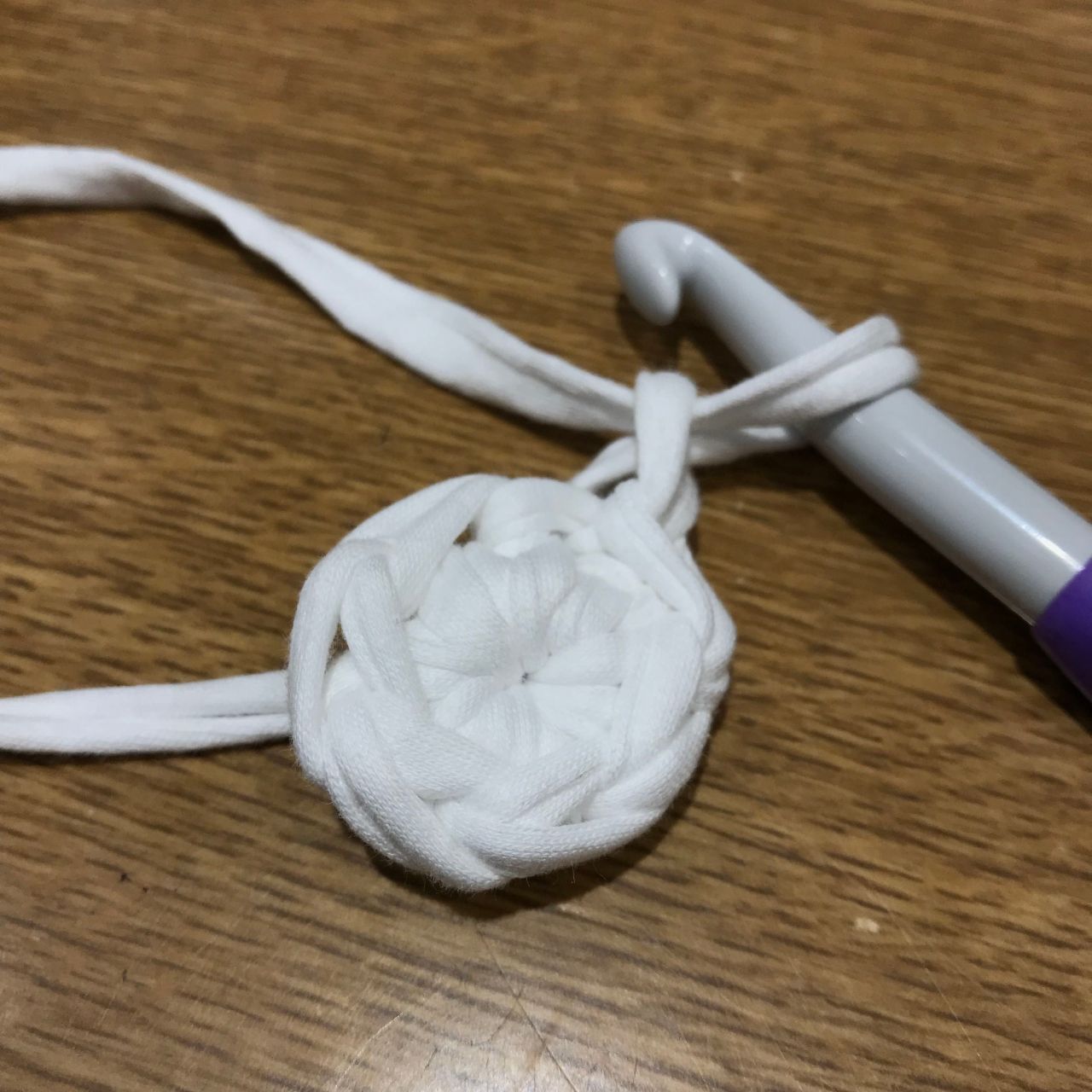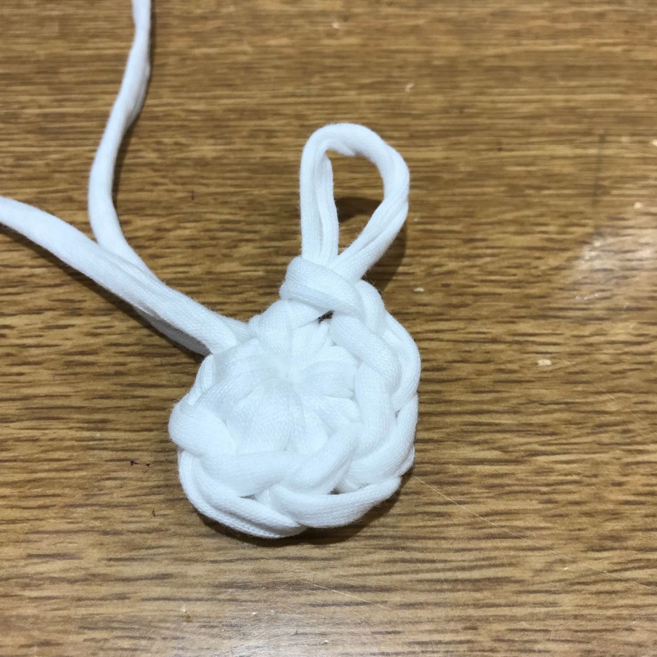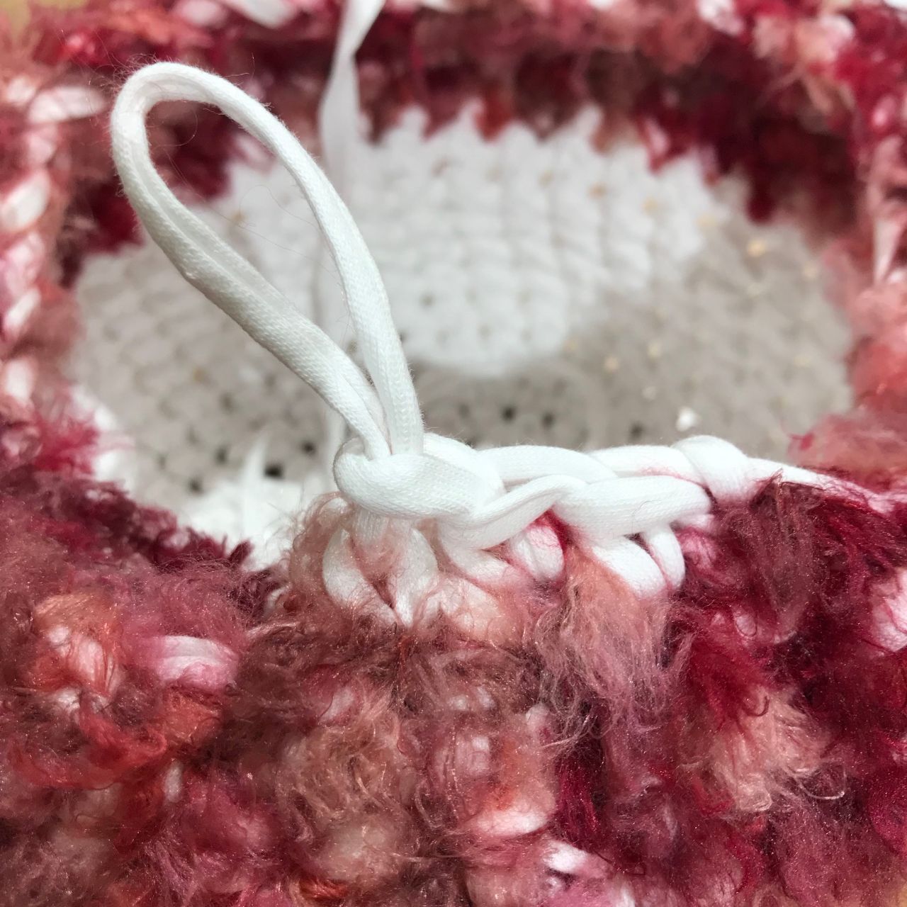ファーの糸のみ糸始末し、ズパゲッティの糸は残したまま続きを編みます