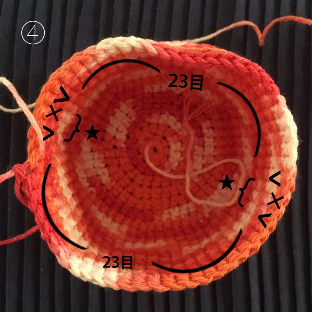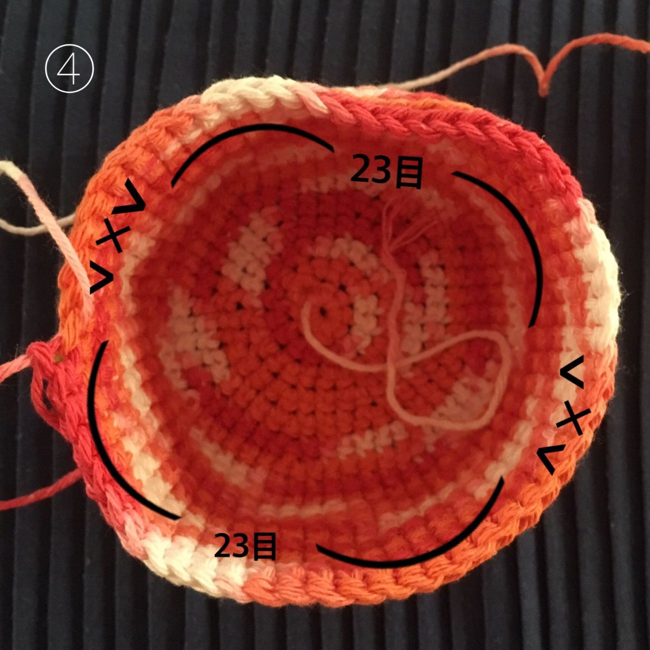 ④ 18段目で4箇所で1目ずつ減らします。