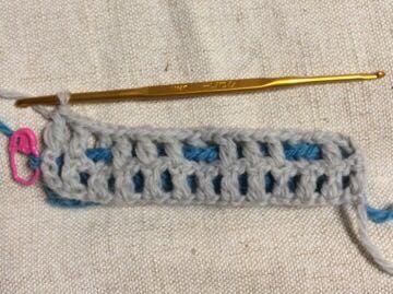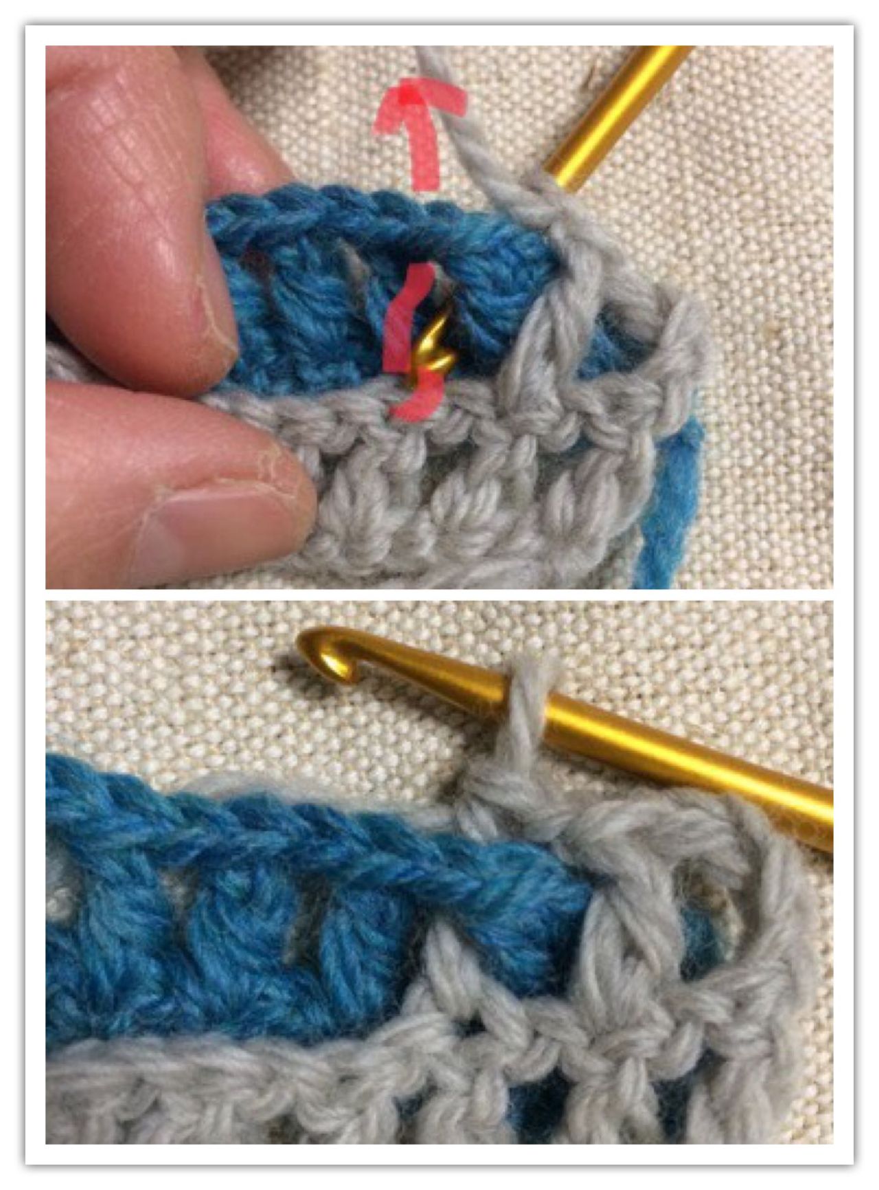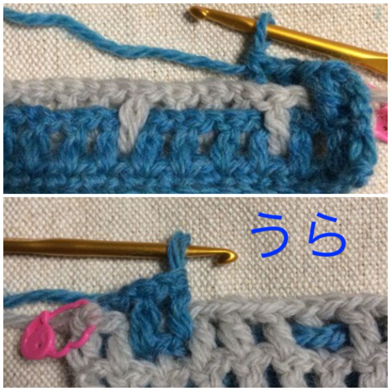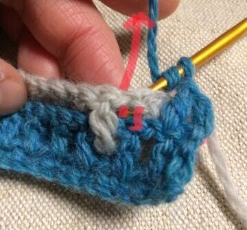 A色(青)の向こう側から針を入れ、B色(グレー)の手前から針を入れて、長編みを編みます。
