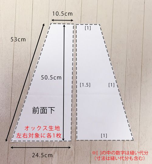 5)[前面]と[側面]の上部と裾部分の縫い代(1cm)を折り曲げて、それぞれ縫います。