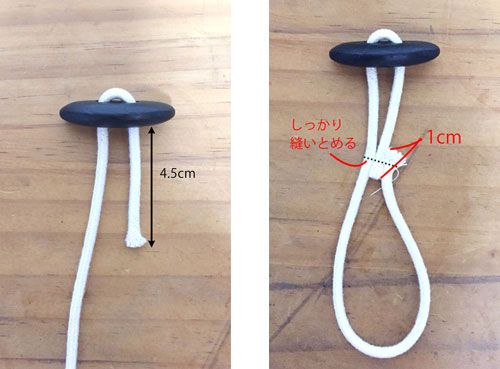 12)30cmにカットしたコットンシルケット (CS202)をダッフルボタンに通し、画像の様に縫いとめます。