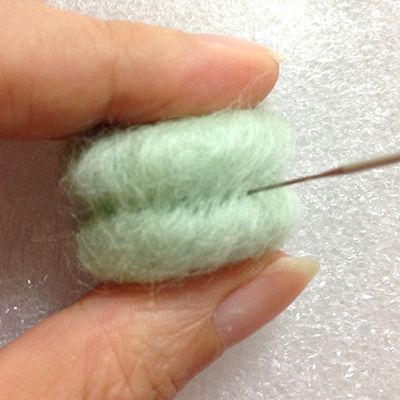 羊毛で土台の円錐形を作り、その周りにマカロンを止めつけていきます。