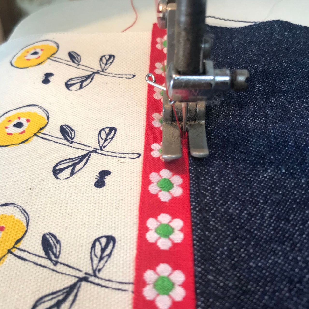 そして、テープやレースは案外簡単に縫いつけられますヨ。ポイントは目立たないミシン糸を選ぶことです笑。目立たなけれは多少曲がっても全く気になりませんっ!!