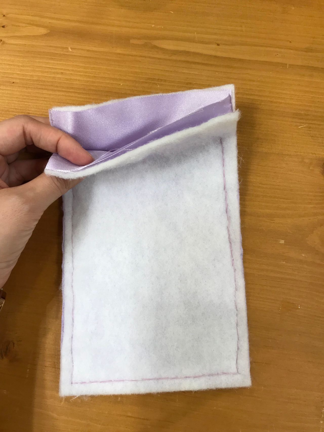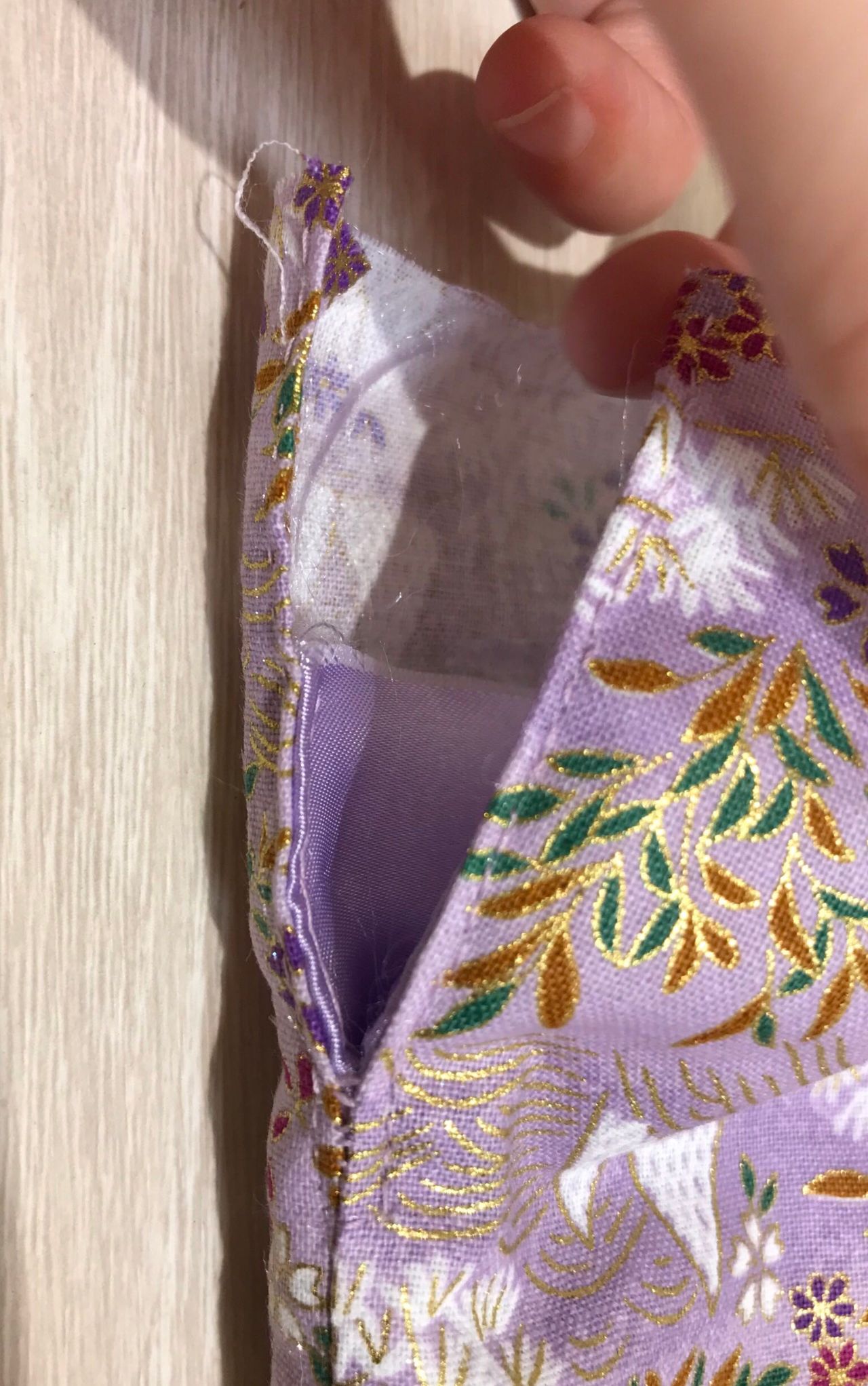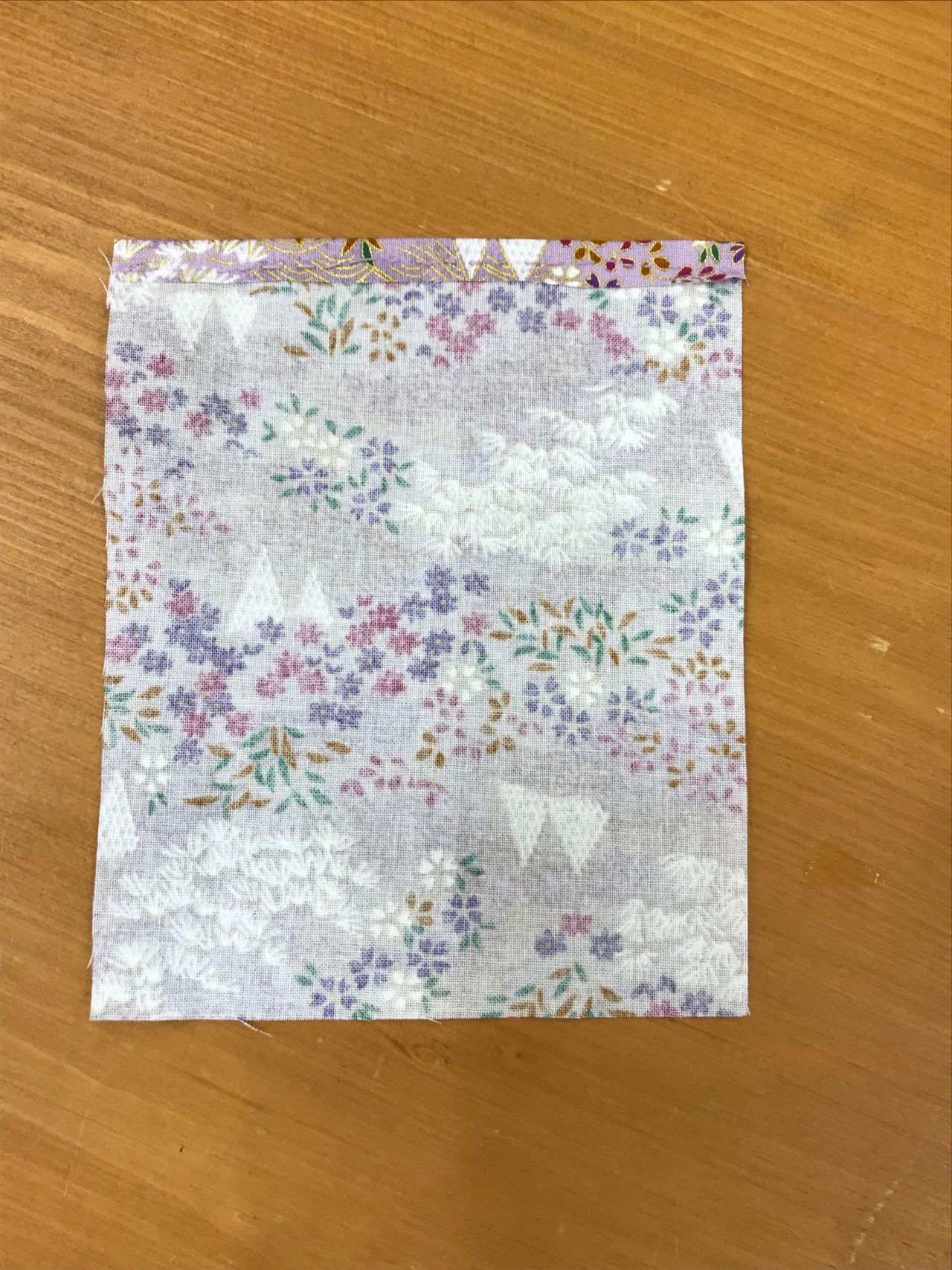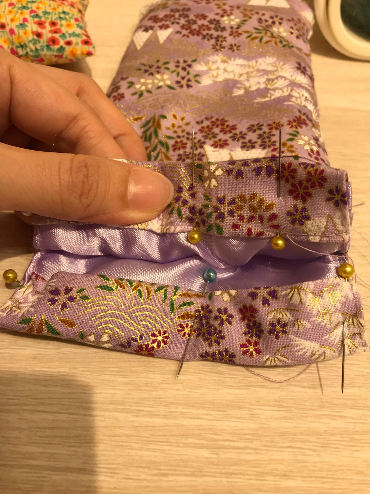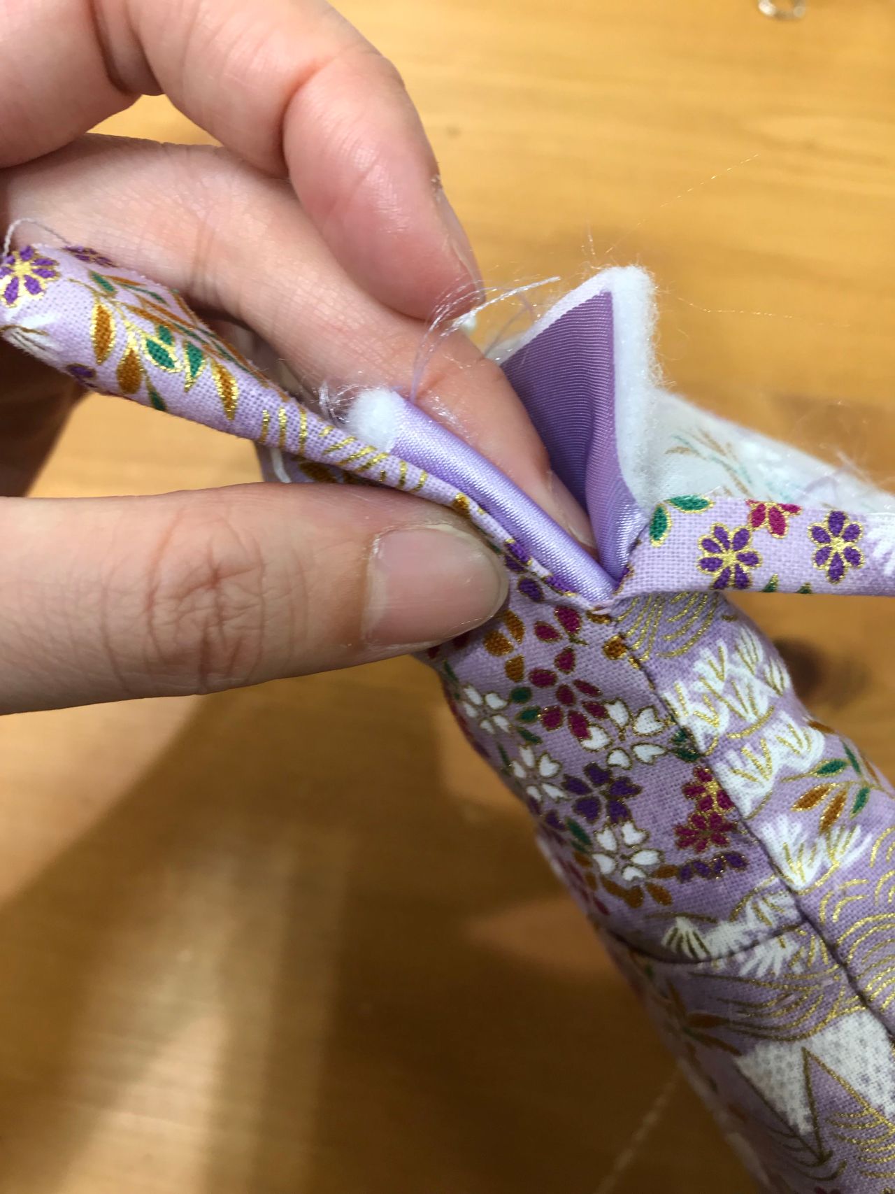 ⑥あきどまりを合わせて縫い代を中に入れ込み表布、裏布、キルト綿を縫い合わせます。