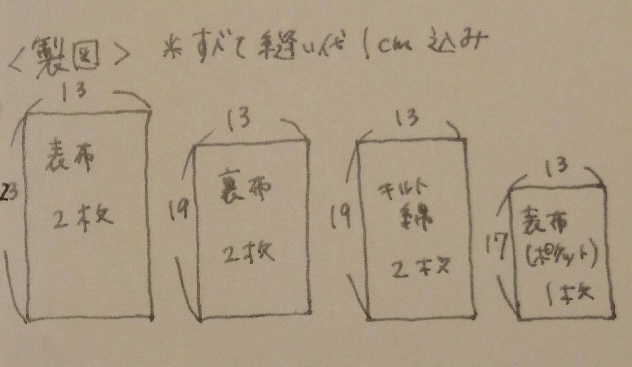 ②ポケットと表布一枚を中表に重ねてその上にもう一枚の表地を中表に重ねます。