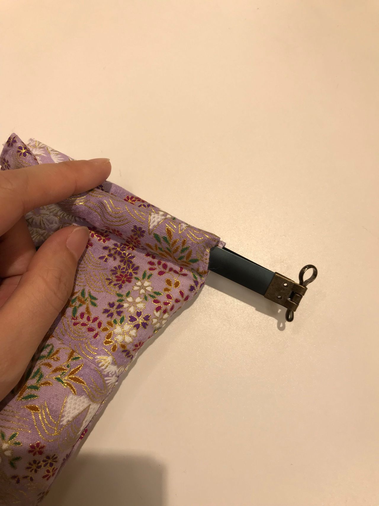 ⑦表布の口の部分を三つ折りにし、バネ口金の通し口を作ります。