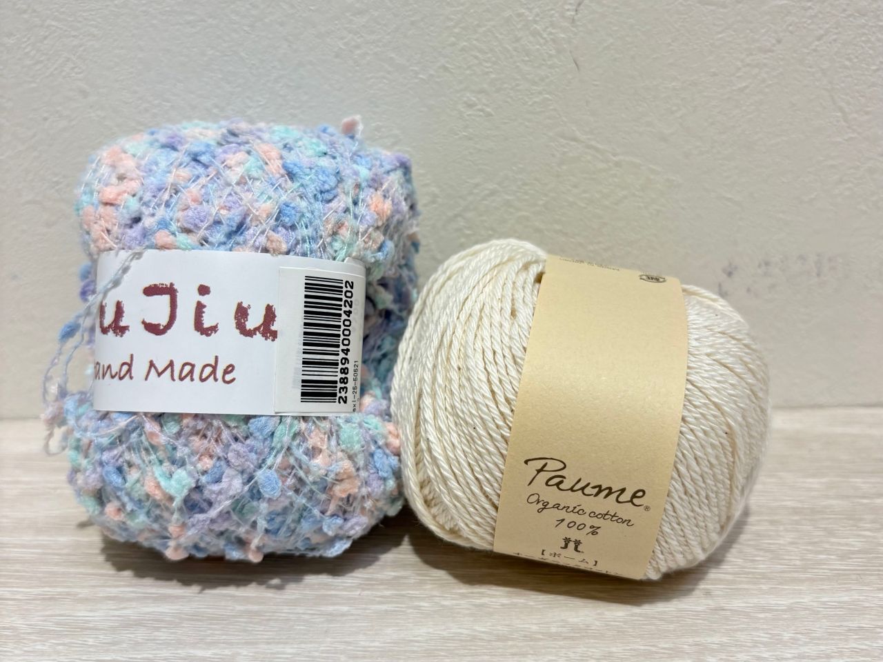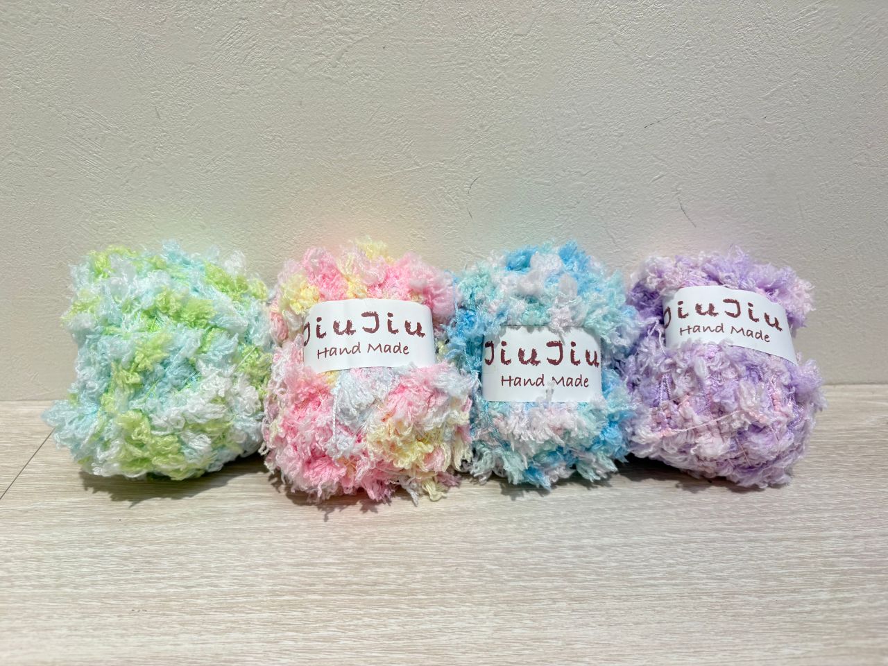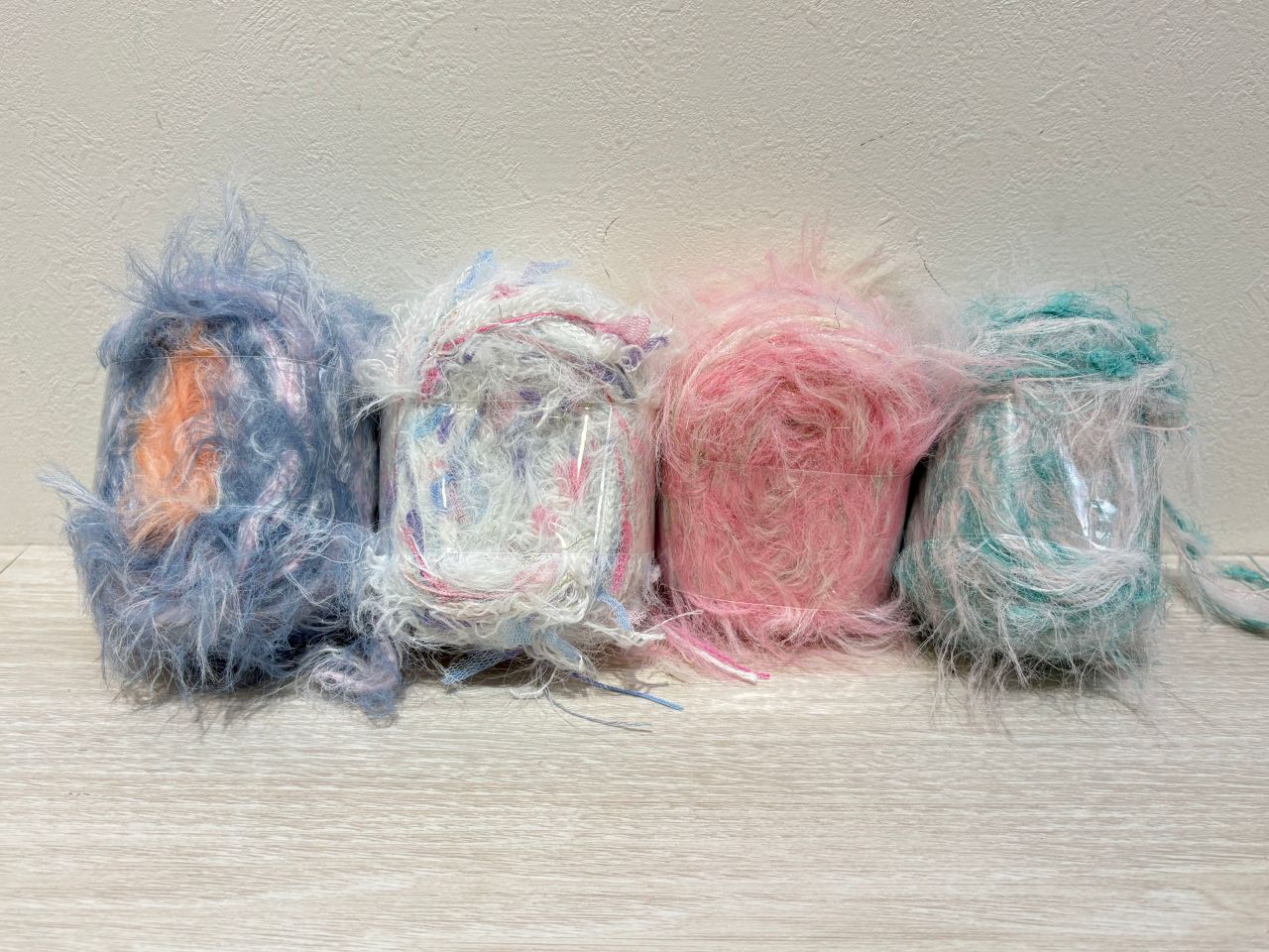 こちらはポームとプチプチヤーンのひきそろえです。
