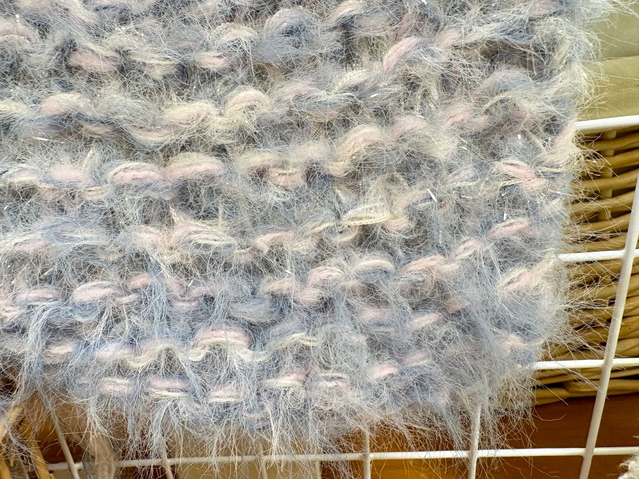 アクリル毛糸のボニーと引き揃えて編みました。(右側は引き揃えず、段ごとに糸を変えて編んでいます。)