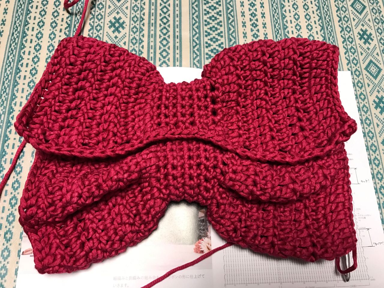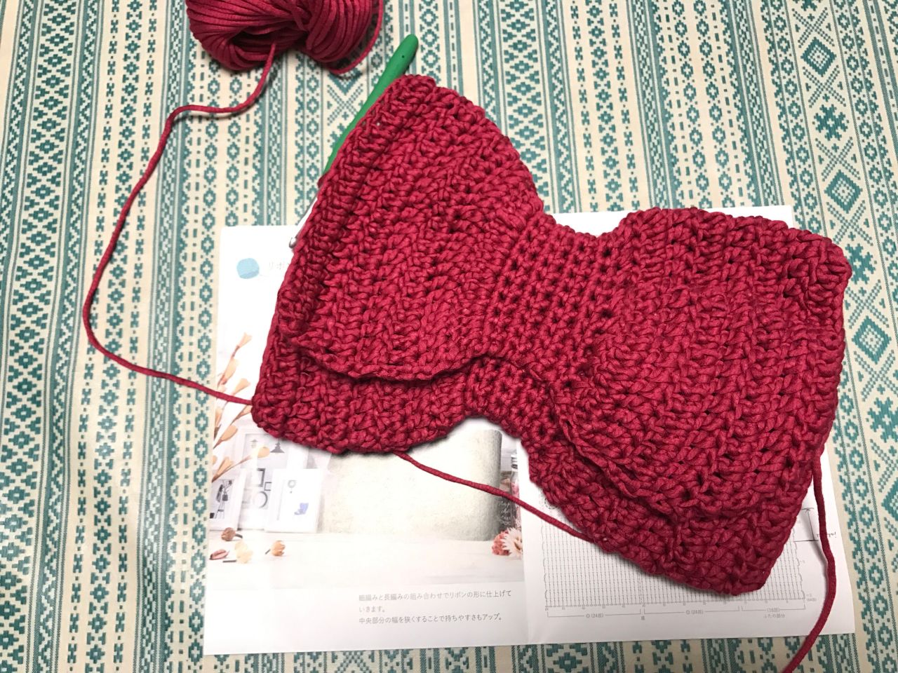 リボンの左右になる部分は編み図では上下になっています。今回は上下の長編み部分を、それぞれ4段減らして編みました。