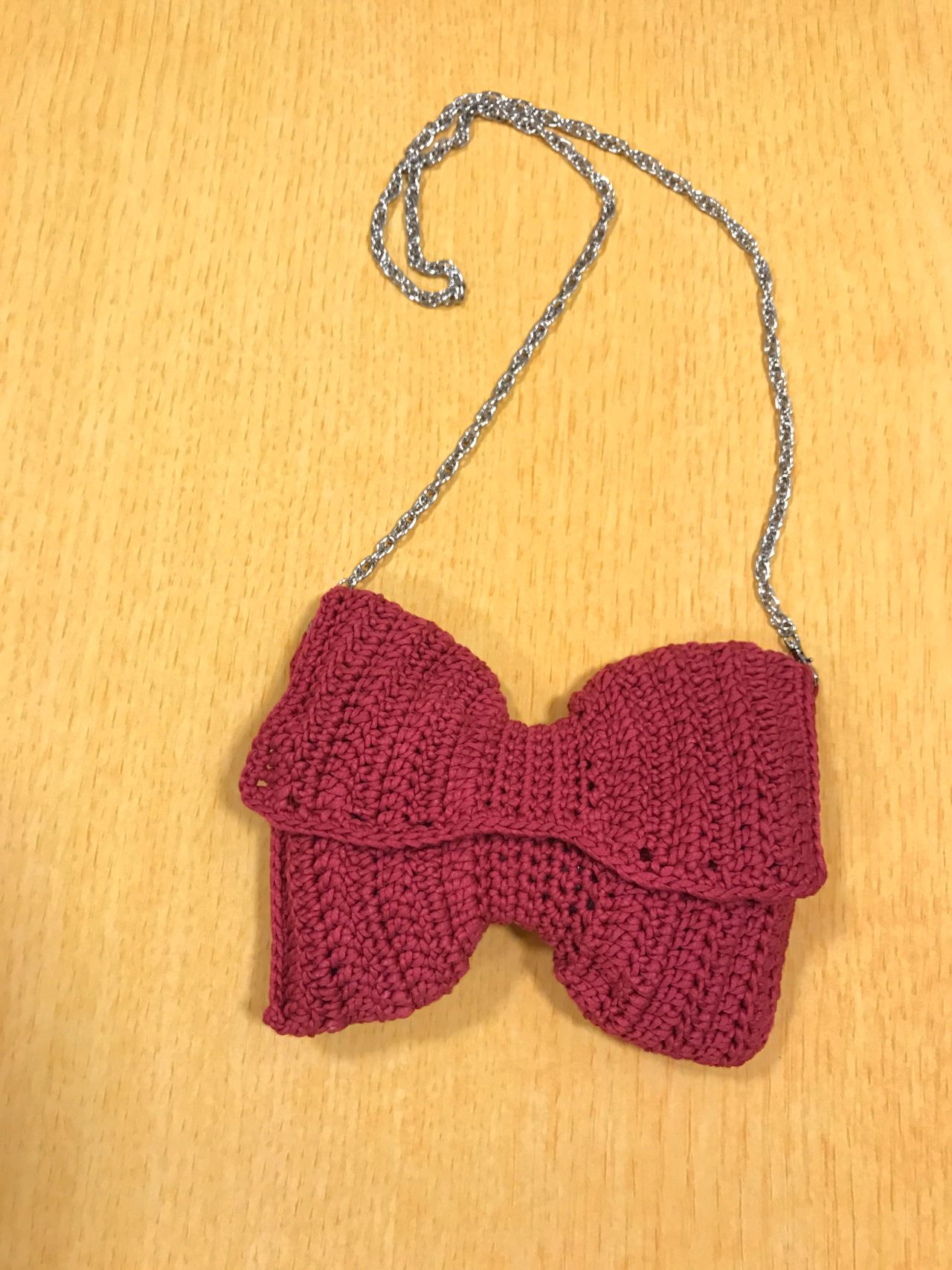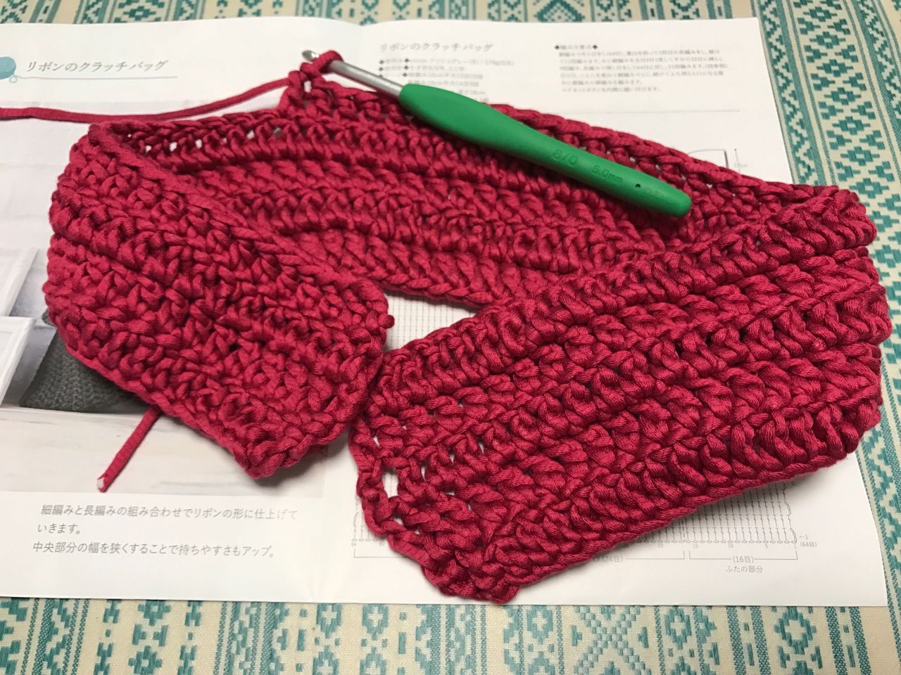 リボン型のクラッチバッグがおしゃれでかわいいので、まつぼっくりも編んでみました!
