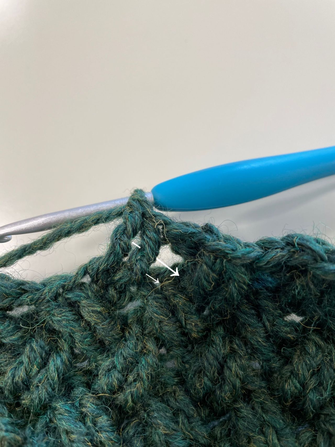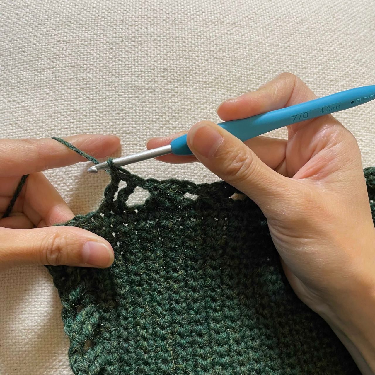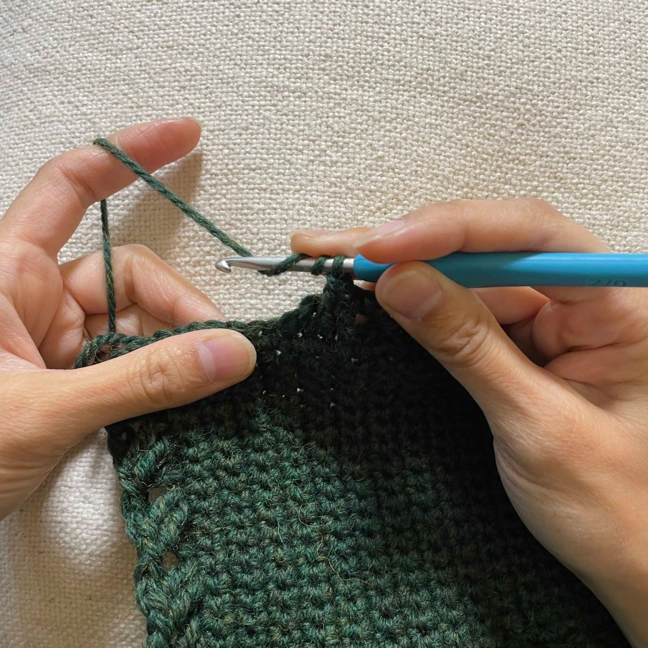 3目、4目めを編む時に1目、2目めの後ろを通って同じように編みます。