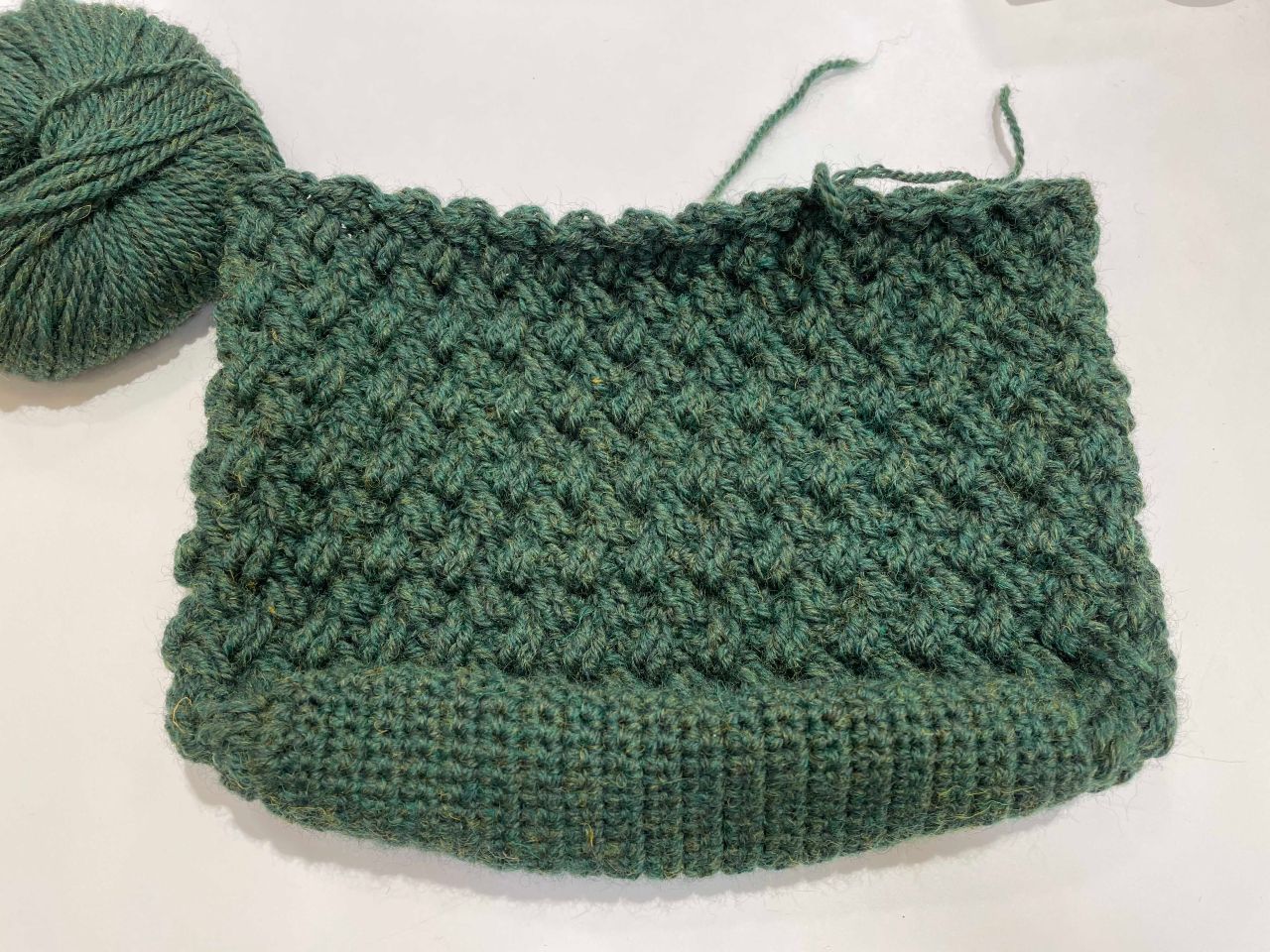 本に掲載されているバッグはアランツィードを使用してます。また、模様編みの段数を減らしたのでサイズは本より小さく仕上がっております。