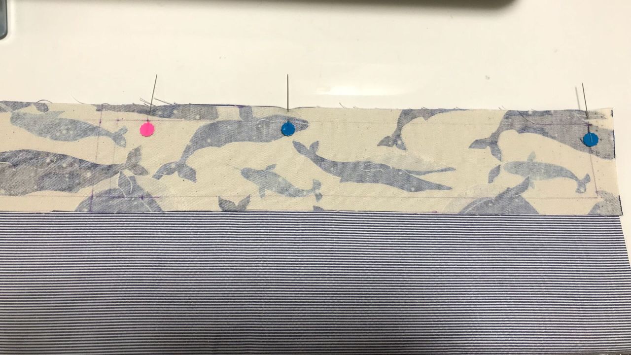 ポケットと裏布の中心を合わせて、横と下部分を指定の位置に縫い付けます。