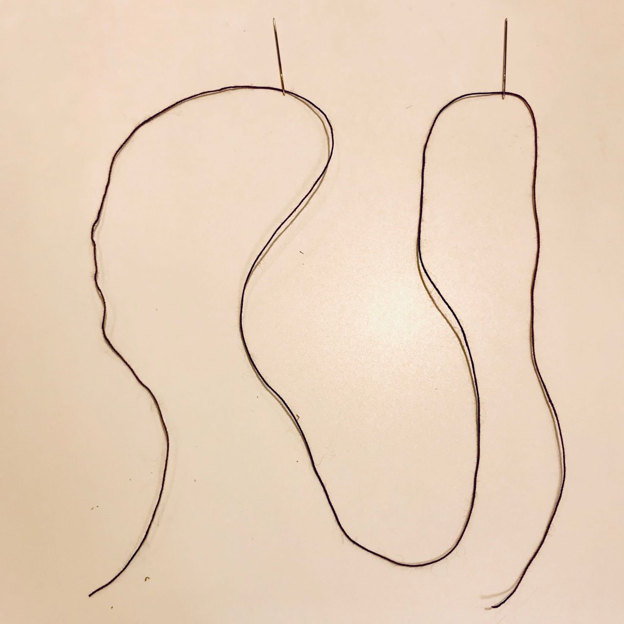 ⑤持ち手をふたつ折りにして革を巻きつけ、縫い付けます。(最初と最後は二重にします)