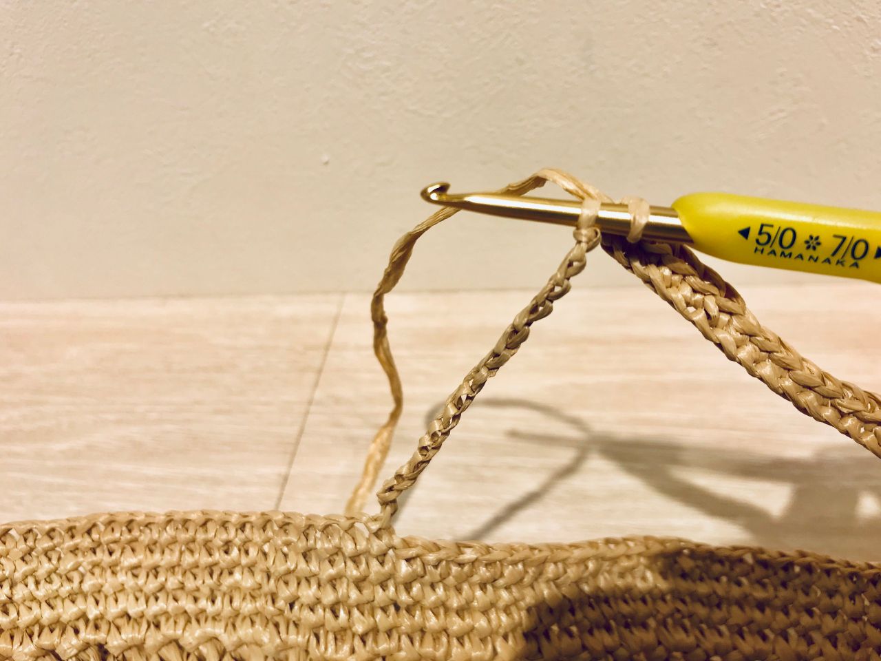 ②45段目から糸を1本どり、5号針に変えて48段目もで編みます