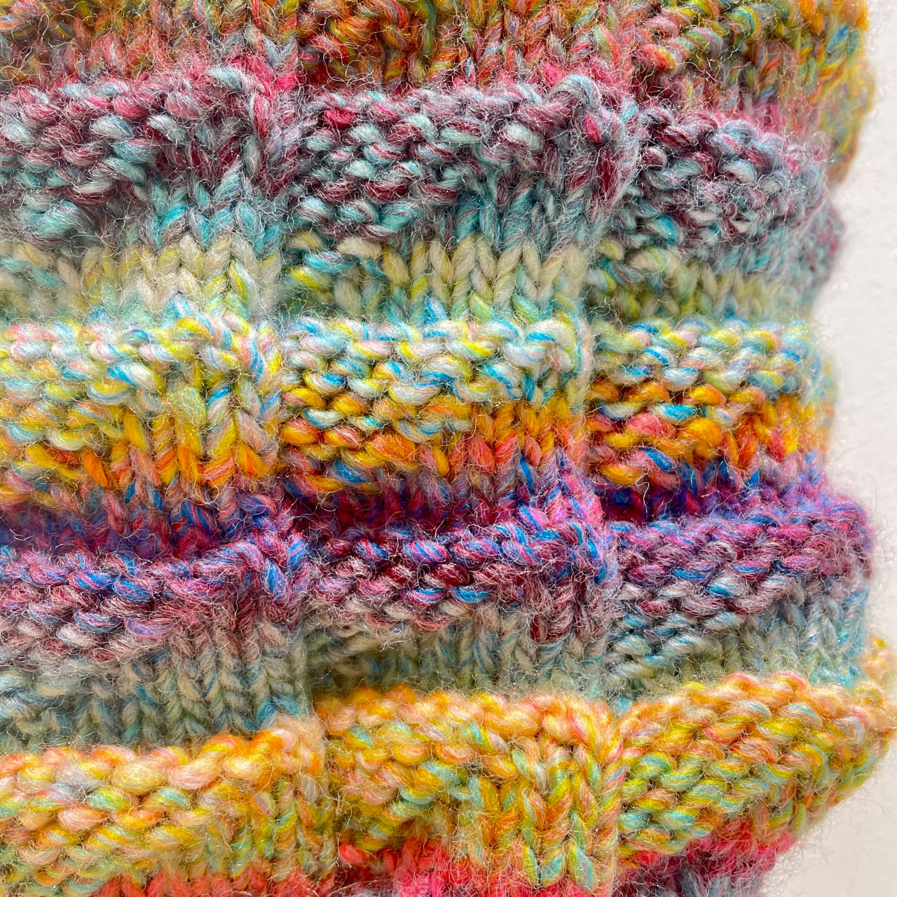 糸の撚りが少し甘く、極太糸なので、ざくざくと編み進めることができ、ふっくらもちもちとした編み上がりになります♪