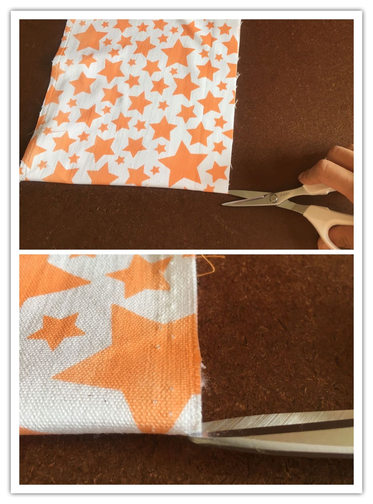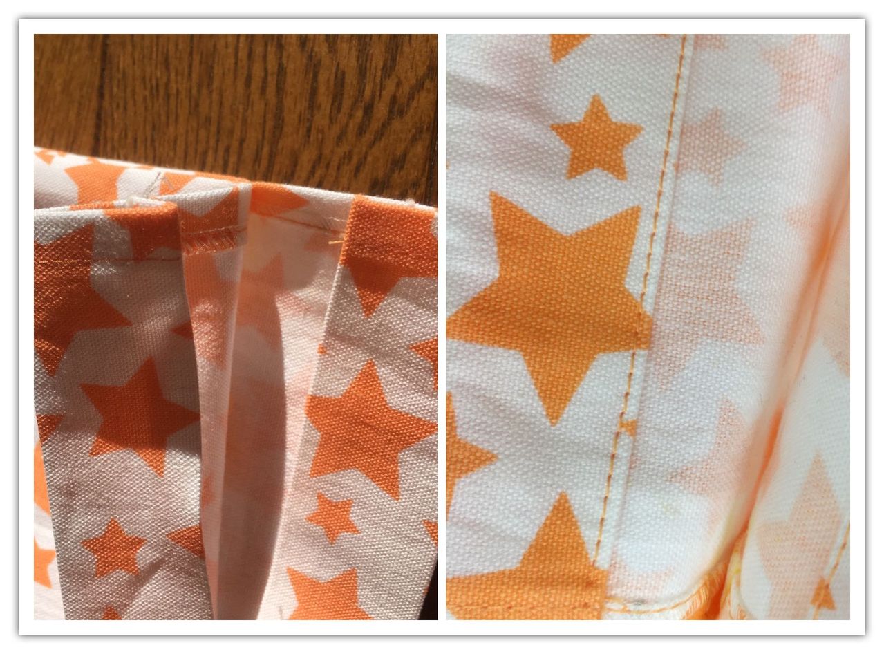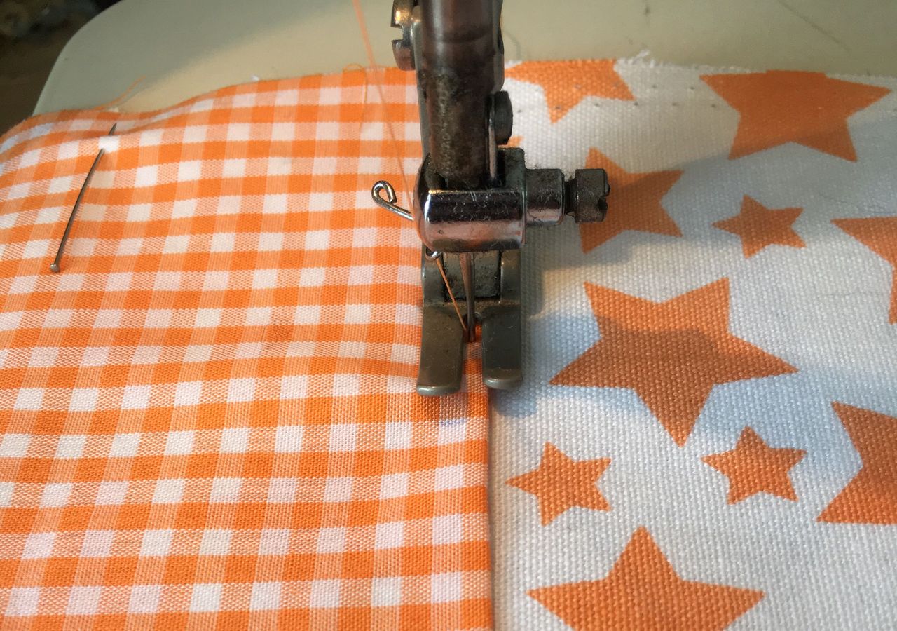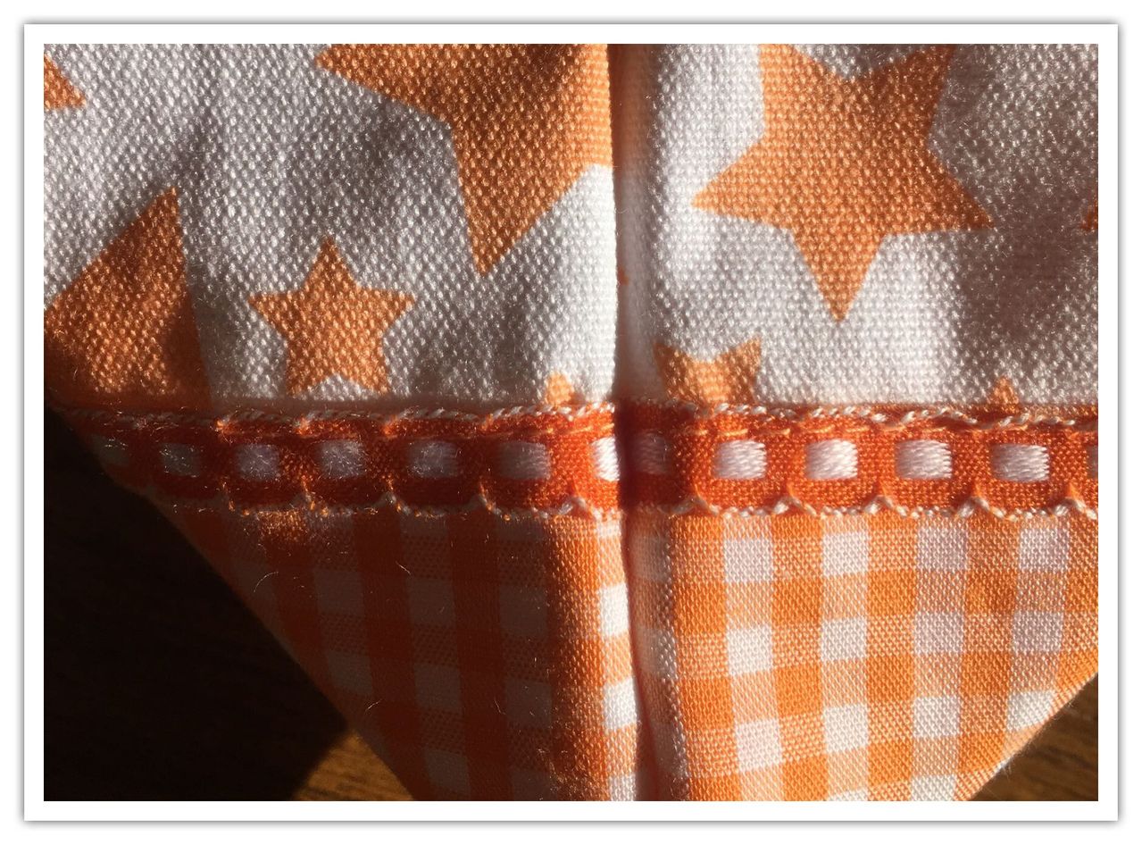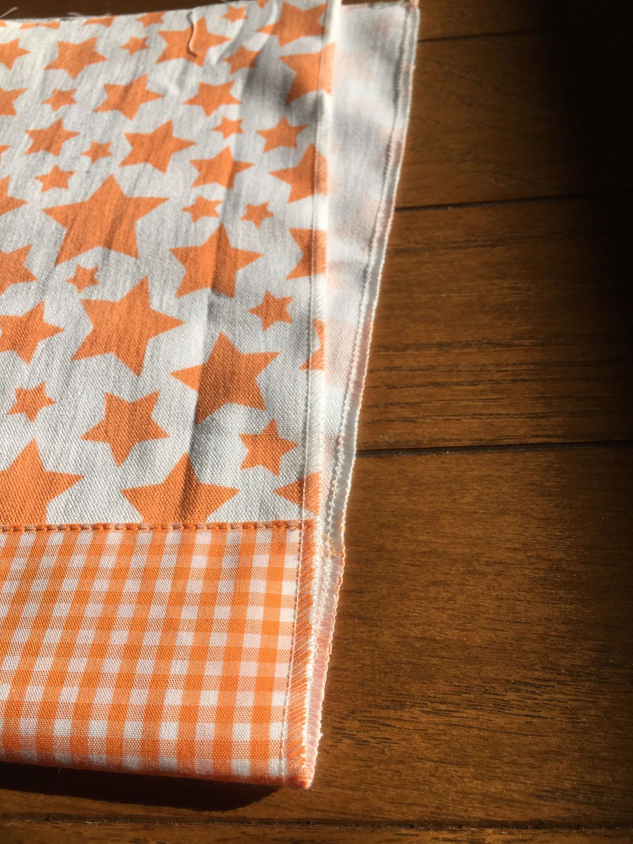 とっても縫いやすいオックス地に、これまた縫いやすいブロードチェック(⬅︎線を引かずとも布が切れる便利な柄♡)そしてさらにアクセントとなるビタミンカラーオレンジのテープをつけます☆