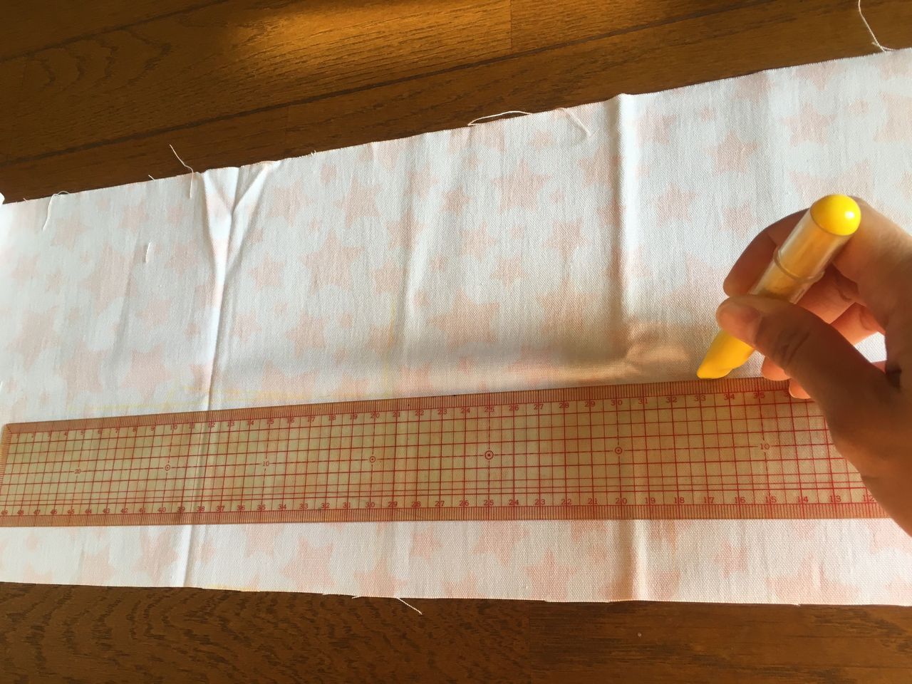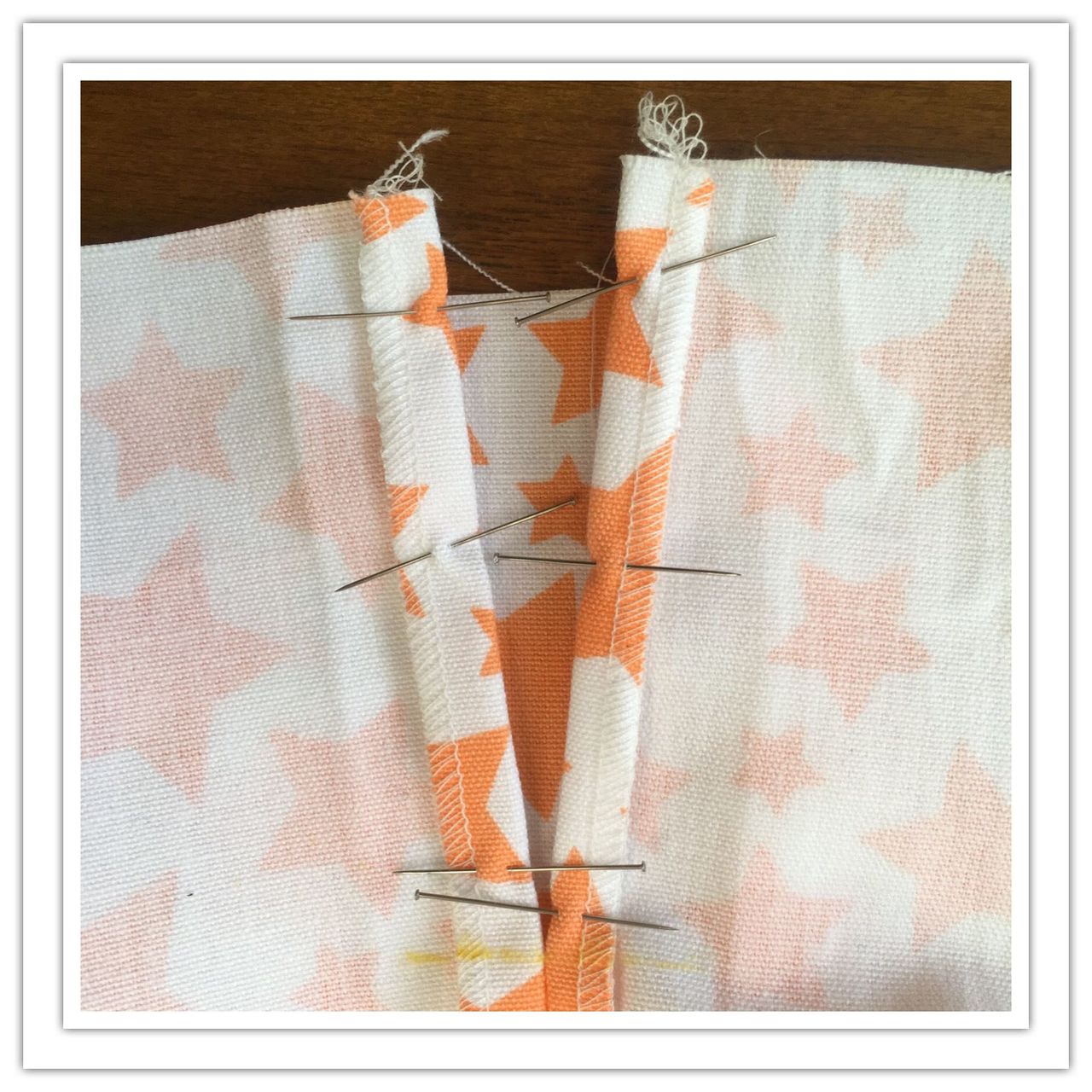 まずアイロンで写真のように折り、マチ針でとめ、あき止りに線をひいておきます。