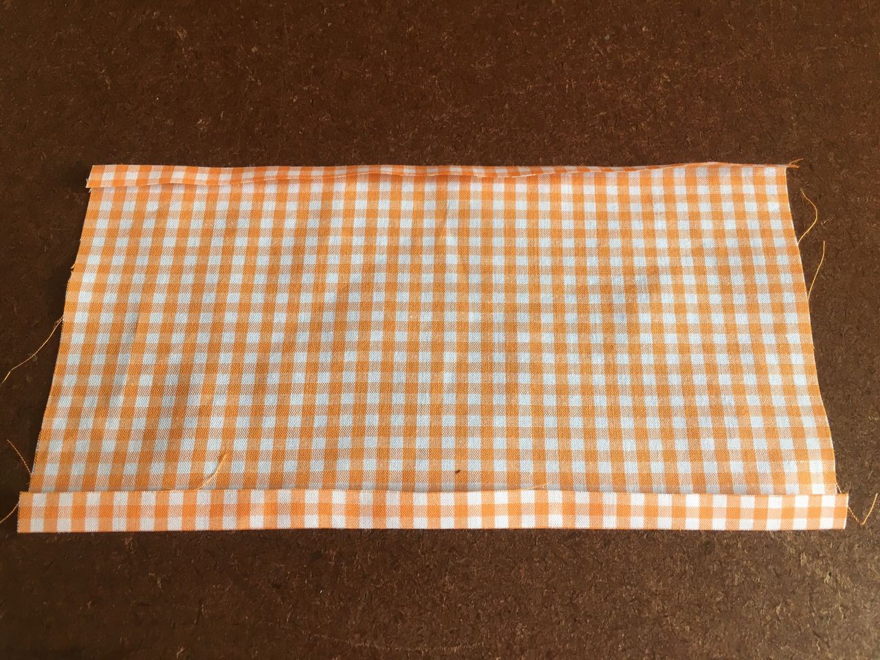 ②底の切り替え布の上下をそれぞれ、アイロンで1cm折ります。