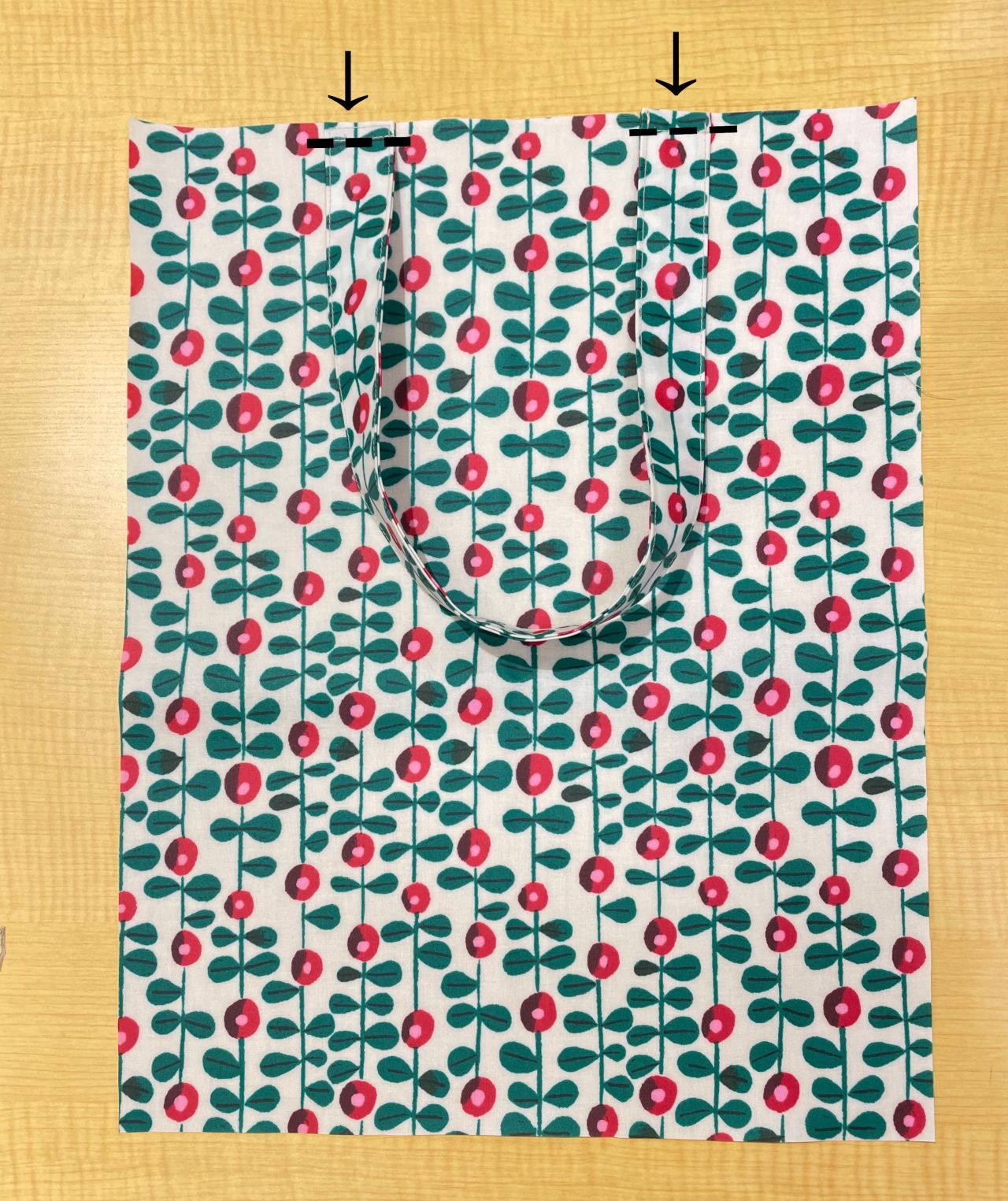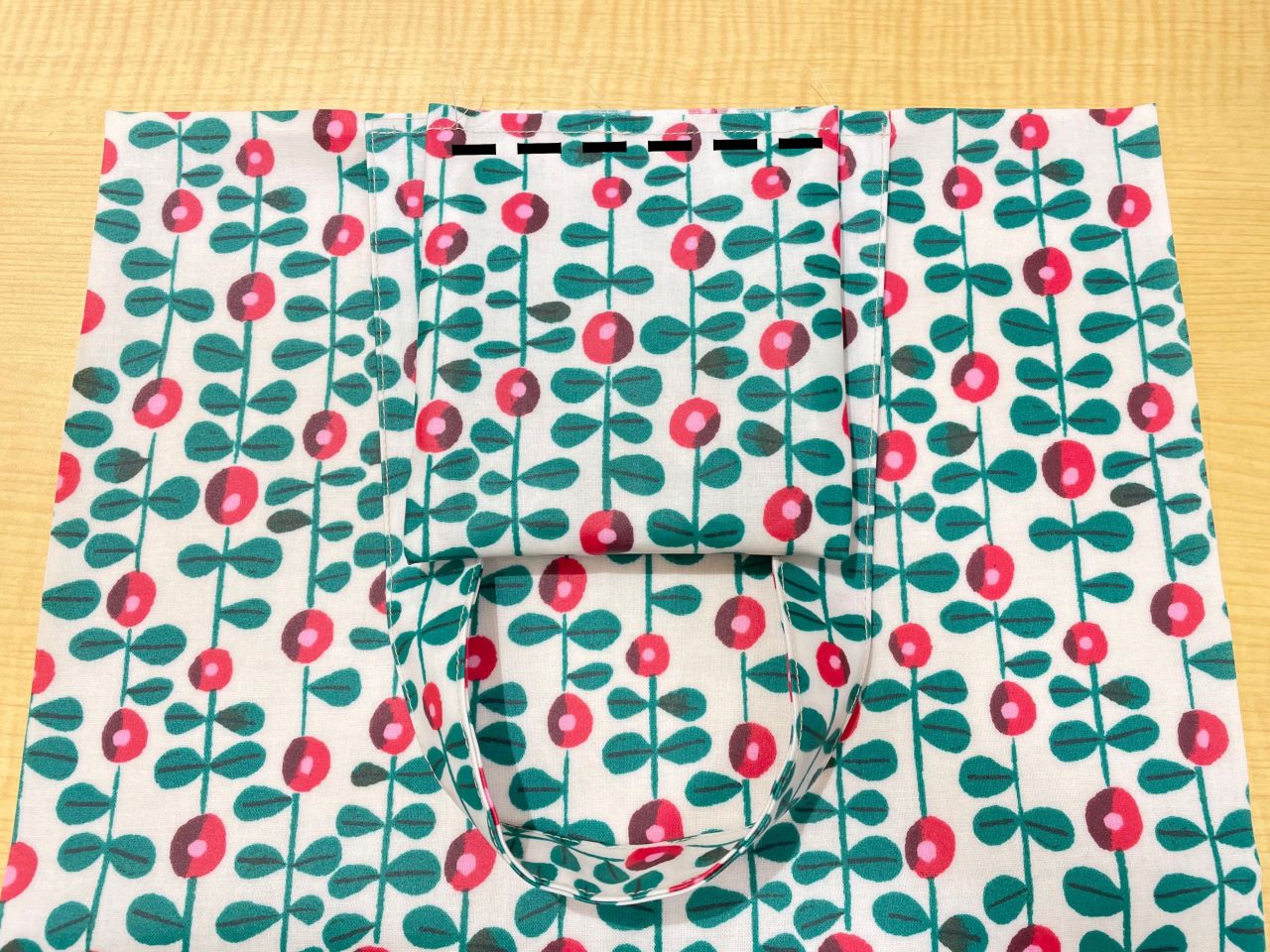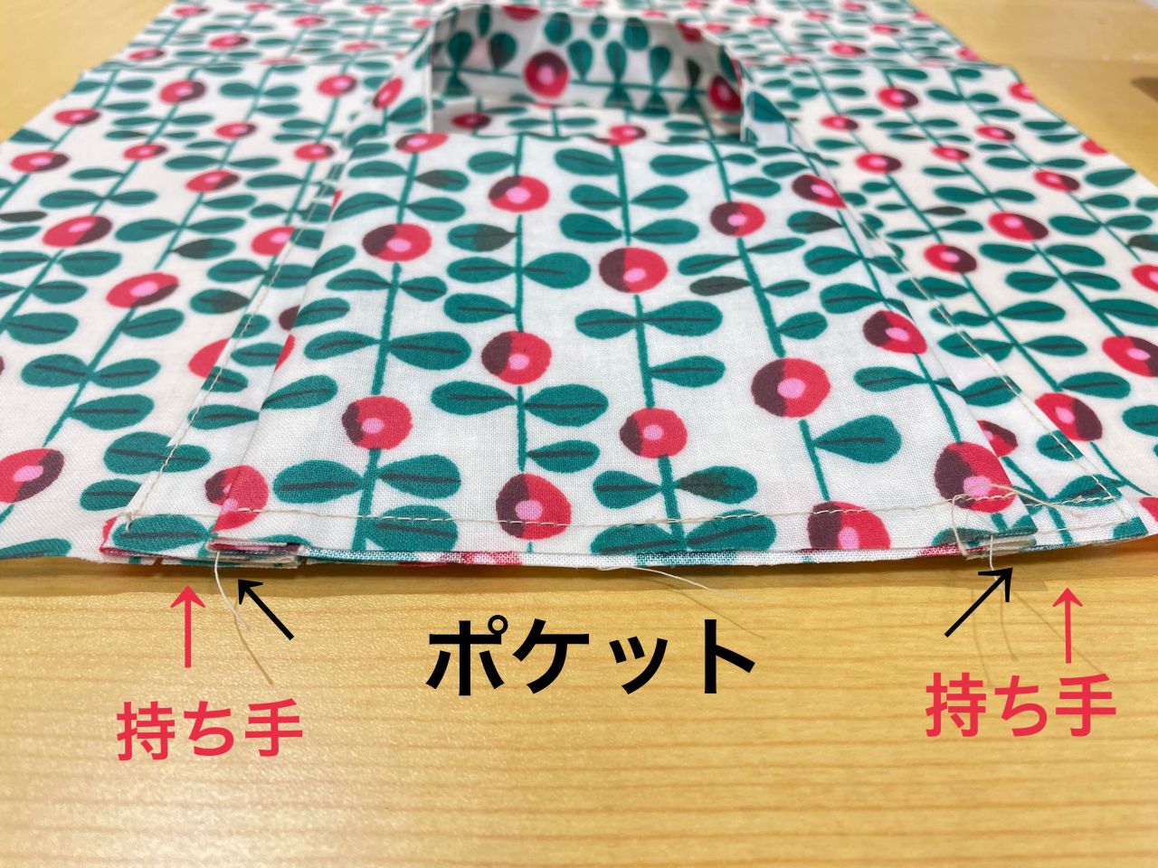 この時すでに持ち手とポケットが重なり厚くなっているので(次の写真)縫うときは一度ミシンを止めて手で回しながら縫い進めると安心です