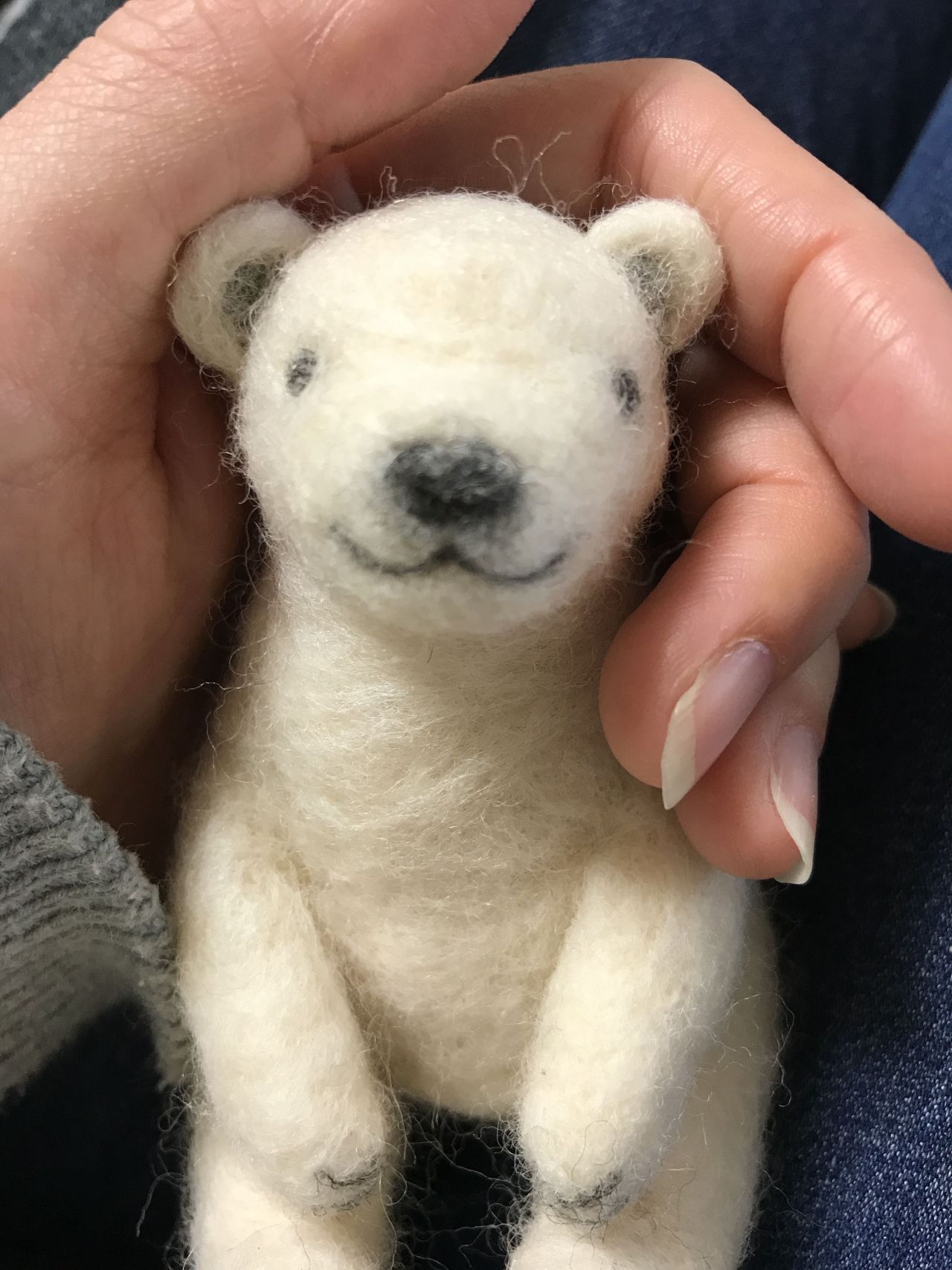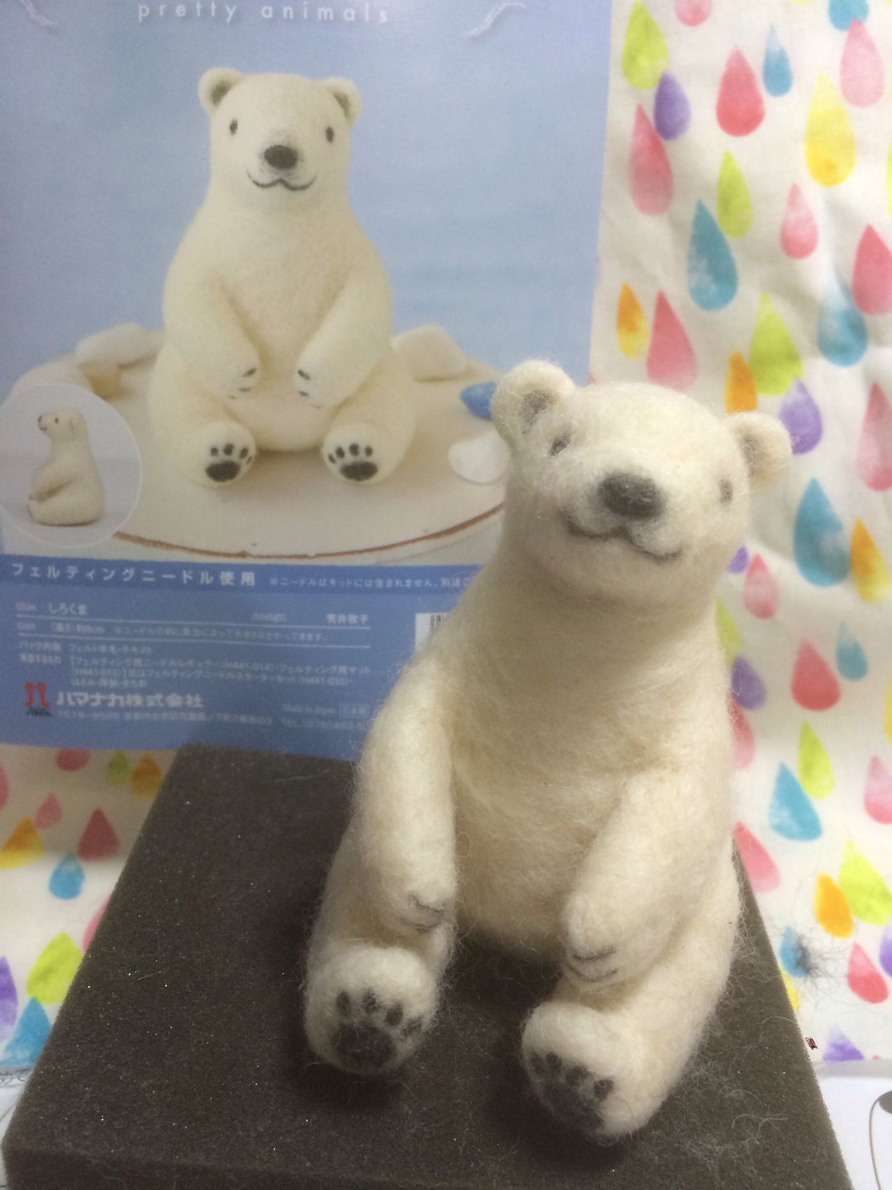 見本とはやっぱりちょっと違う顔立ちになりました。そんな風に作る人によって顔が変わったり、簡単に変化をつけられるのも羊毛フェルトのいいところ!