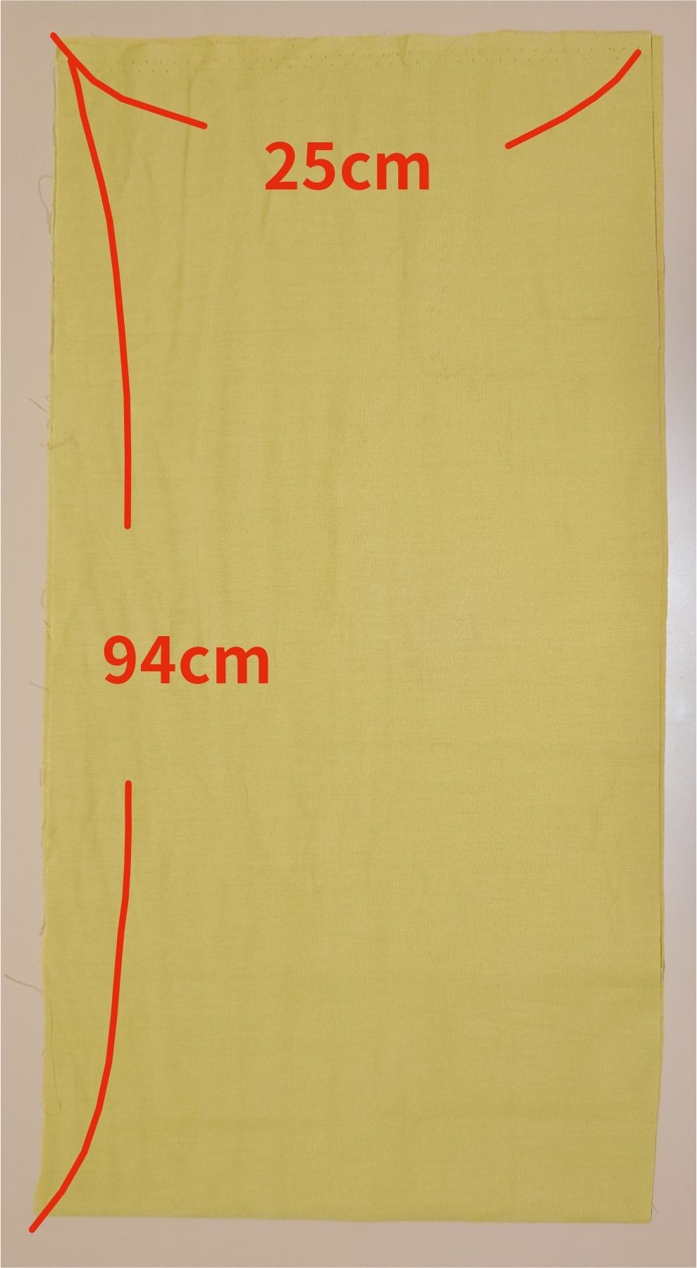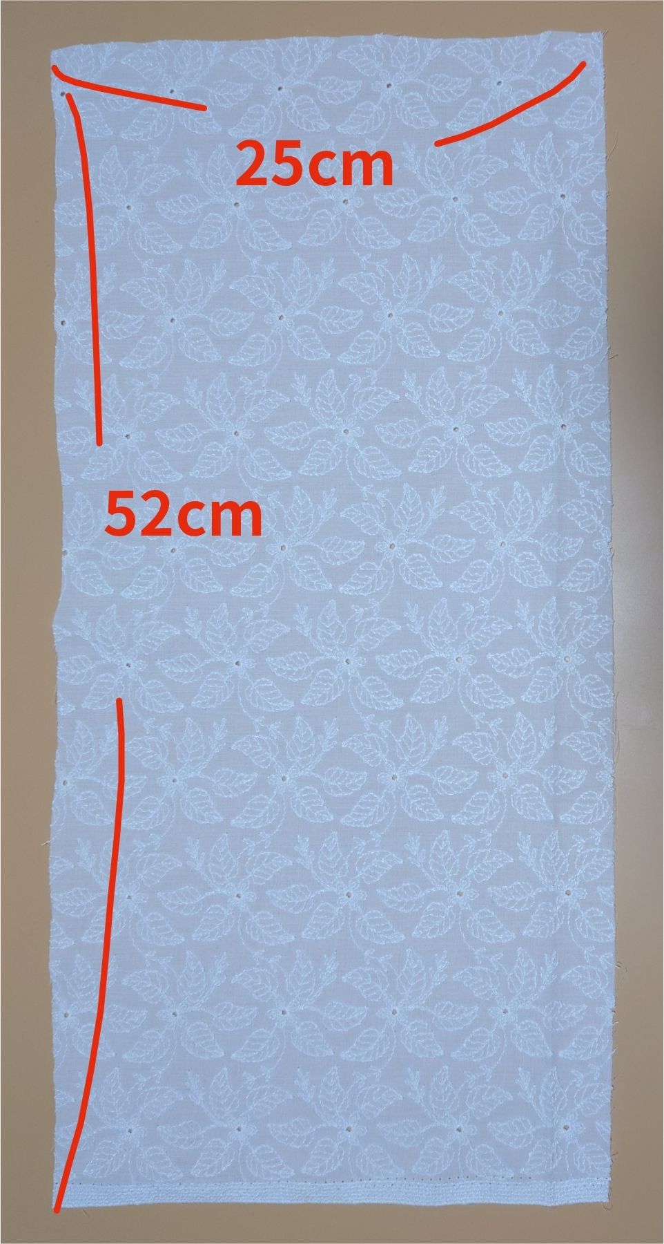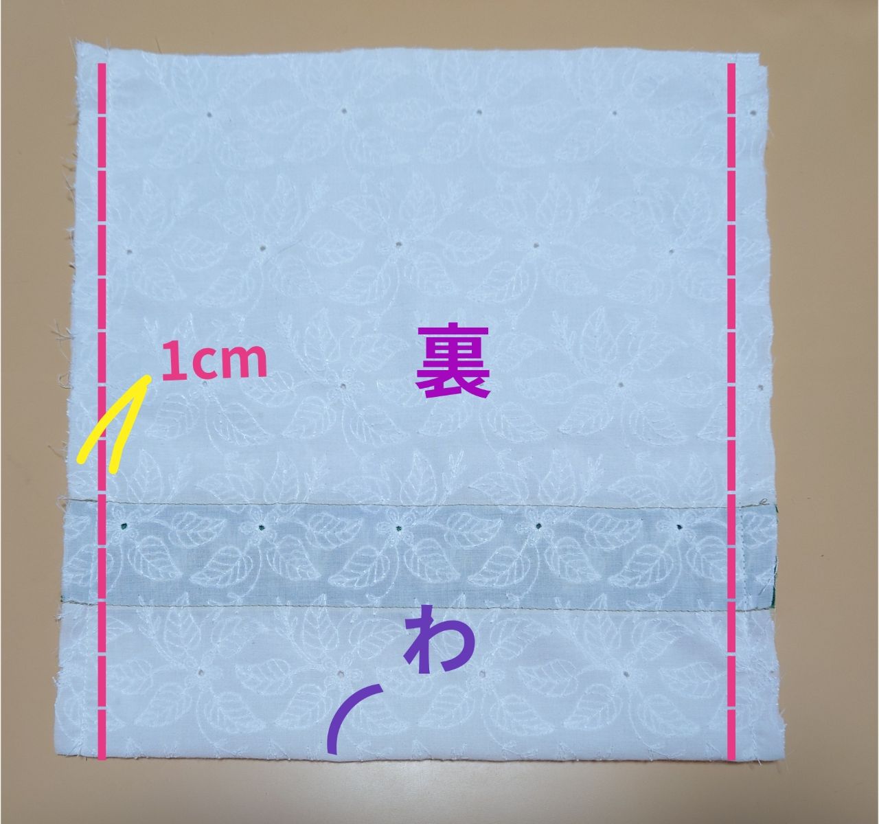 ②レース生地の底をわにして中表に二つ折りにし、両サイドを縫い代1cmで縫います。縫い代は割ります。
