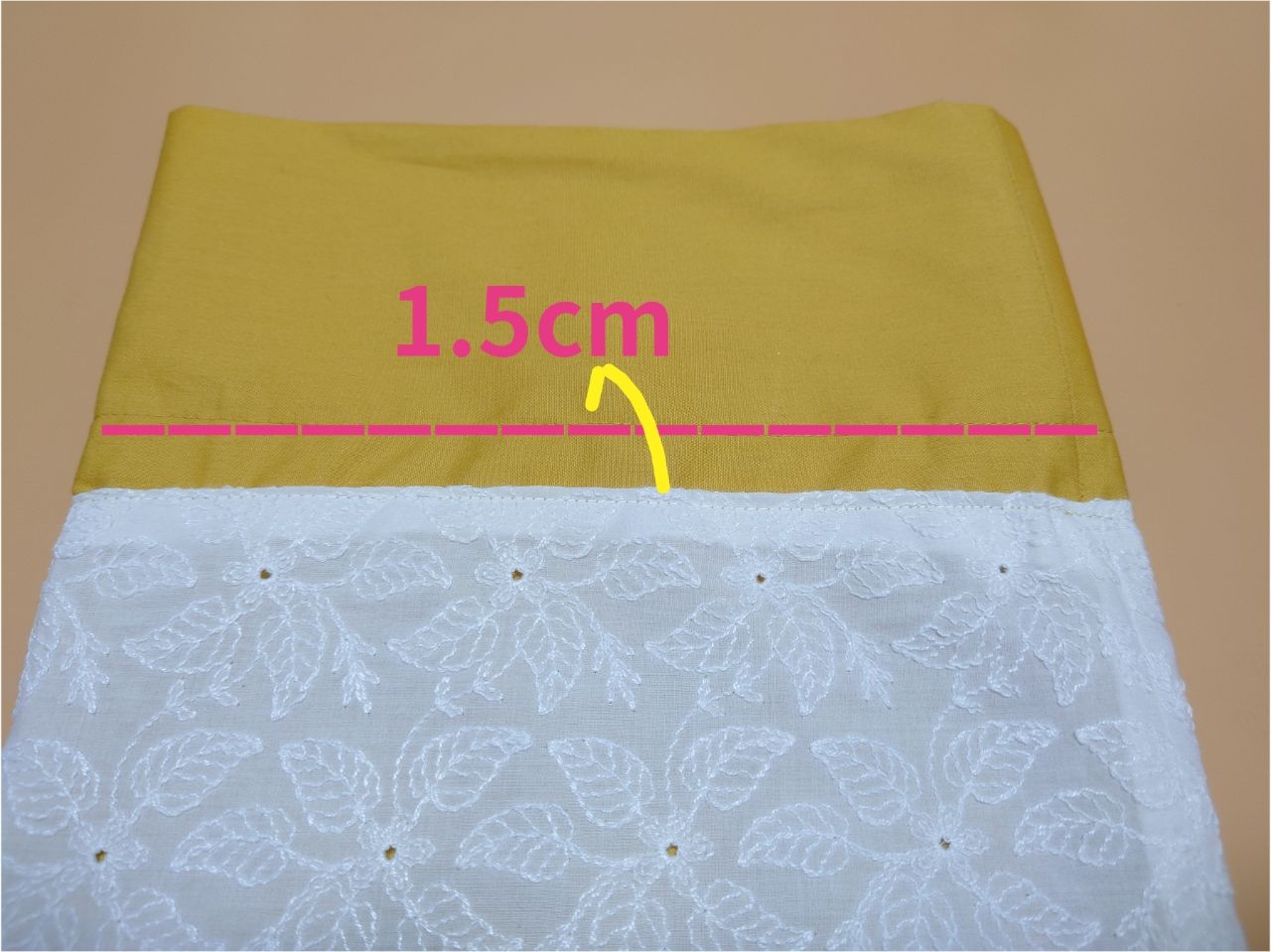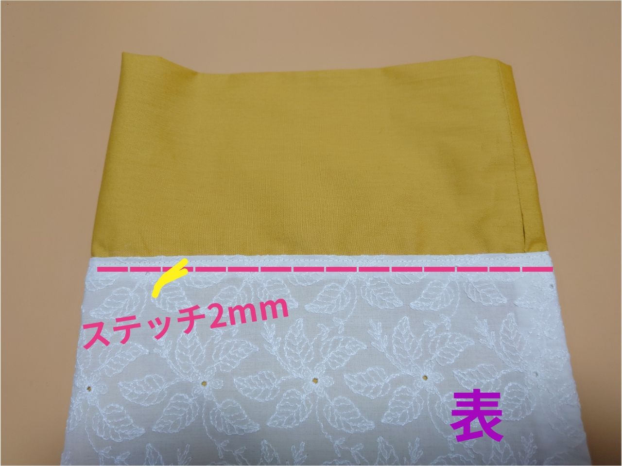 ⑥レース生地とブロードを重ねレース生地部分をぐるっと1周ステッチ2mm縫います。