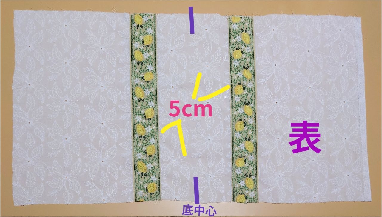 ①底を中心に、それぞれ5cmのところにカフカリボンを縫い付けます。