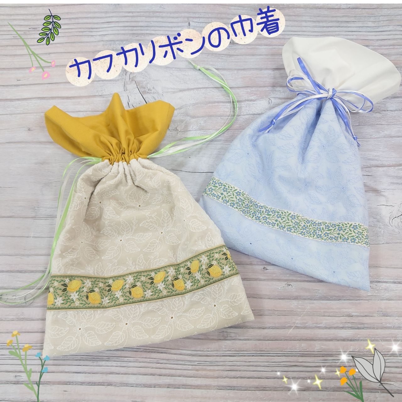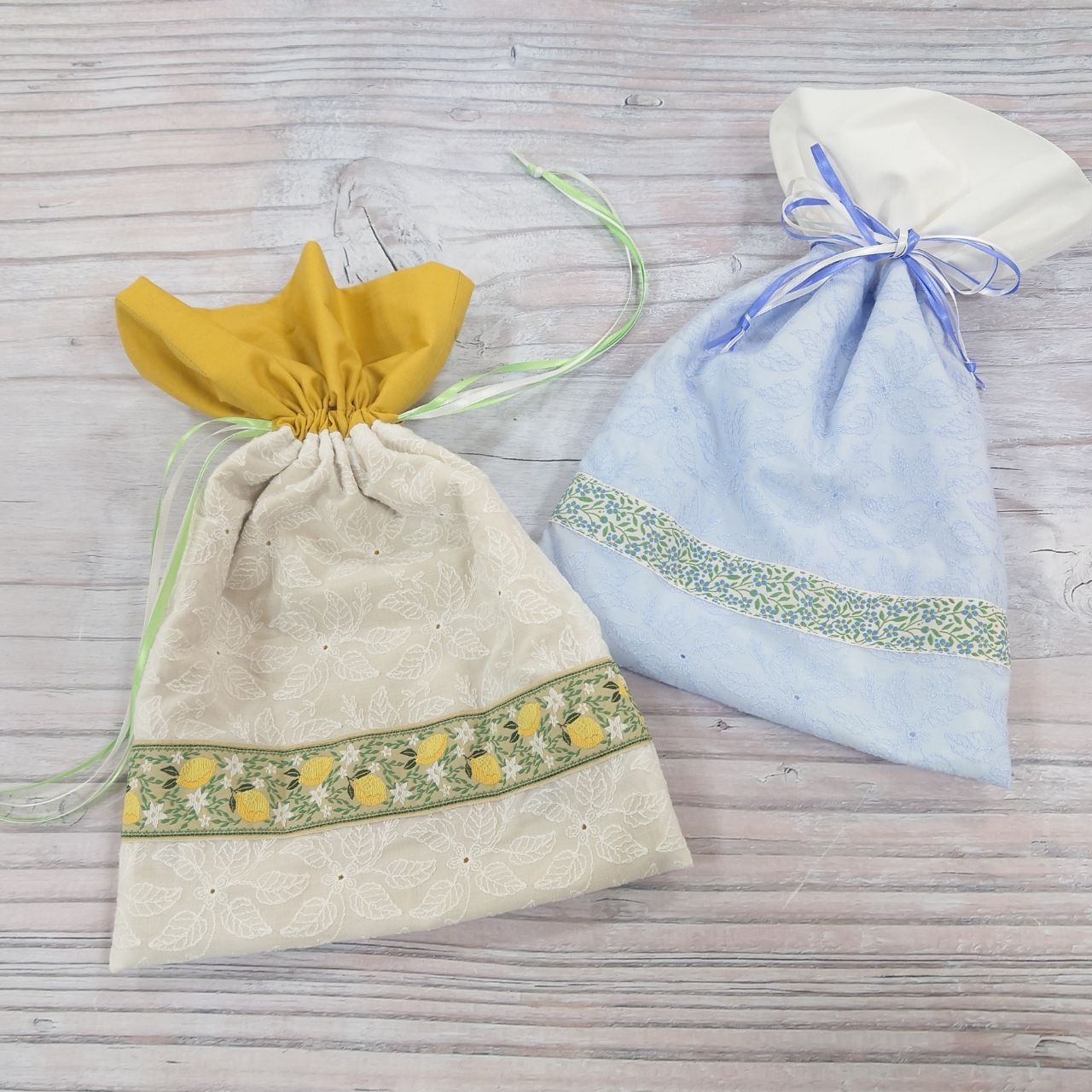 白い生地も、装飾するとイメージがだいぶ変わりますね。まっすぐ縫うだけで簡単に作れる巾着を考えてみました!