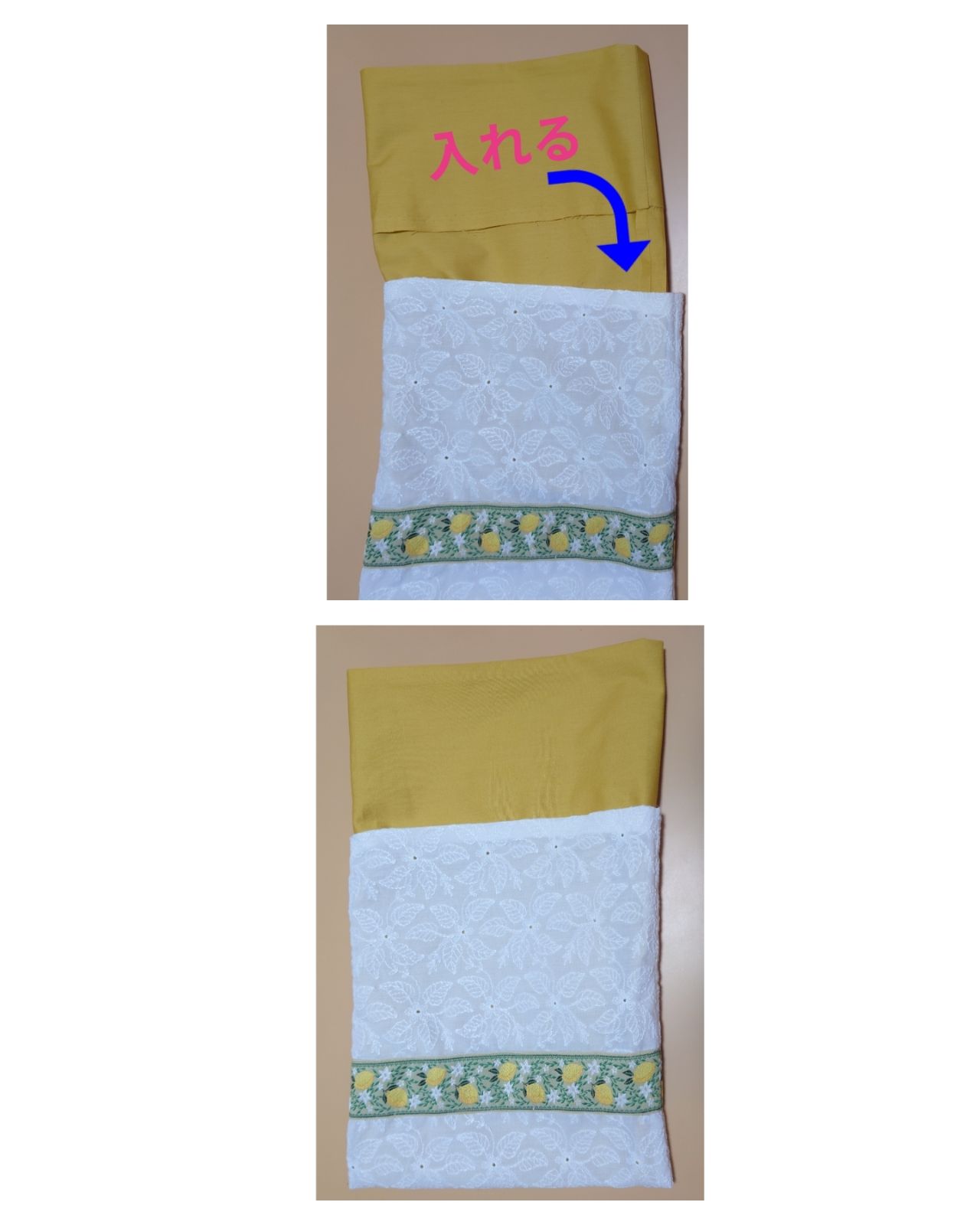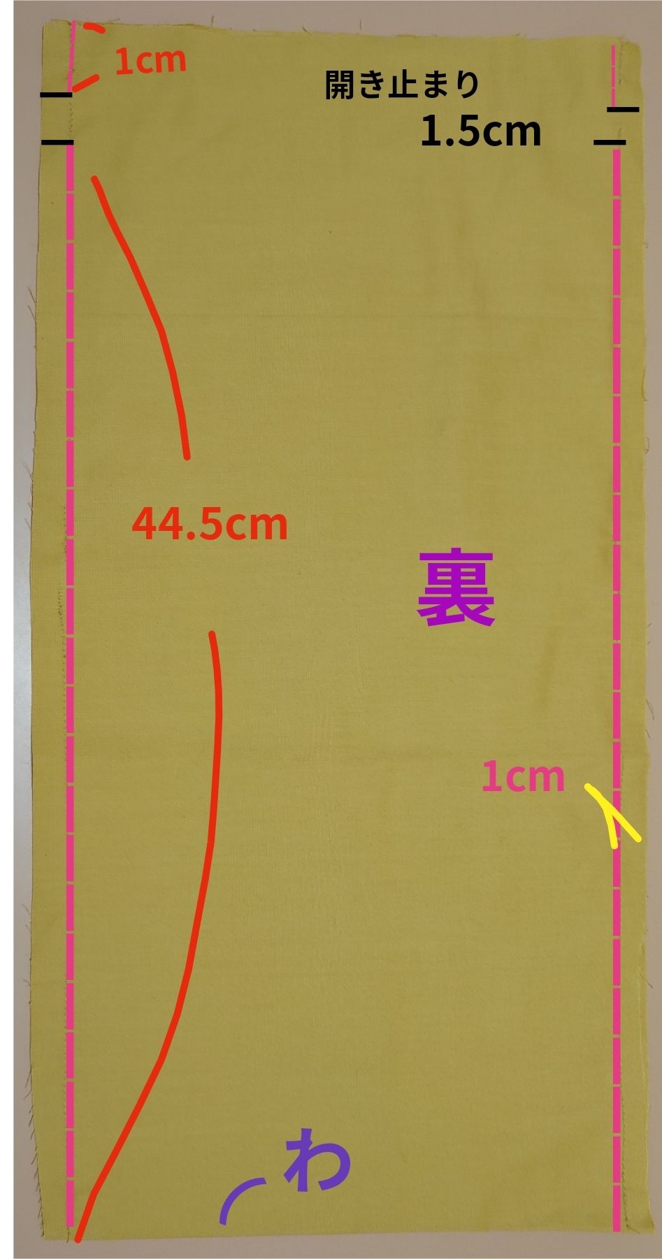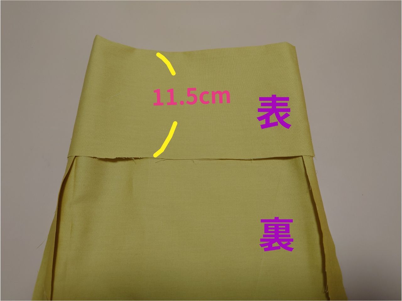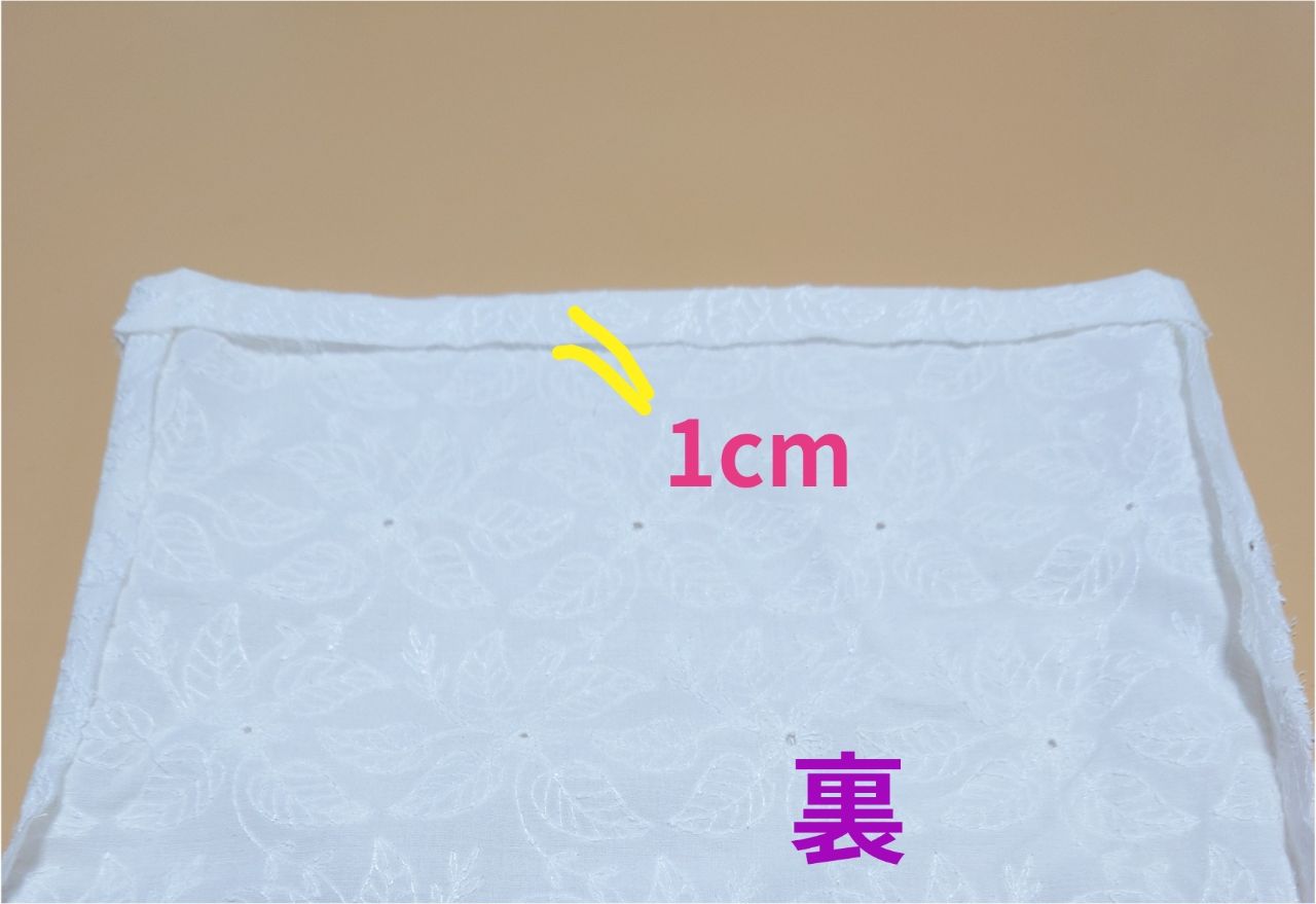 ③入り口の縫い代1cm折ります。表にひっくり返します。