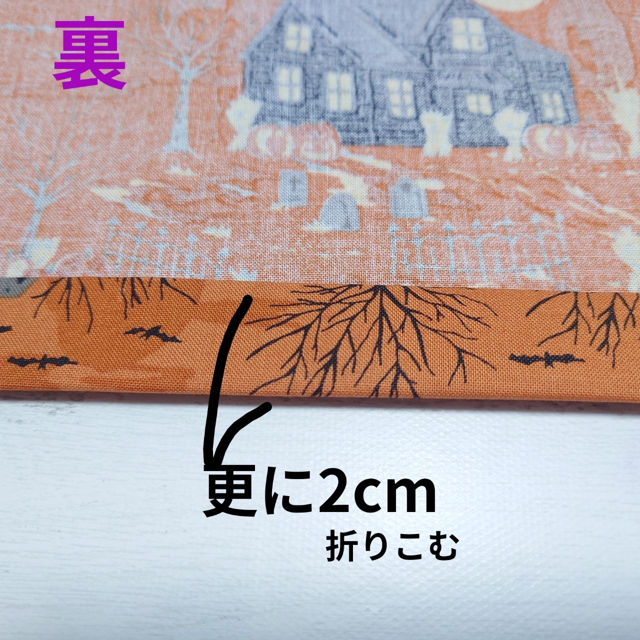 ⑧更に2cm折り、三つ折りにします。
