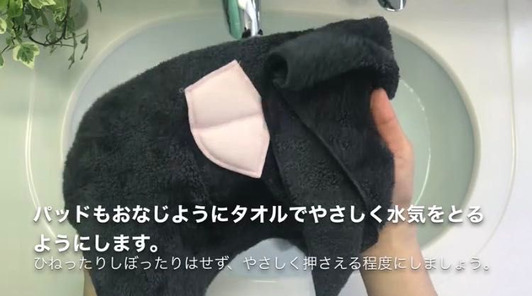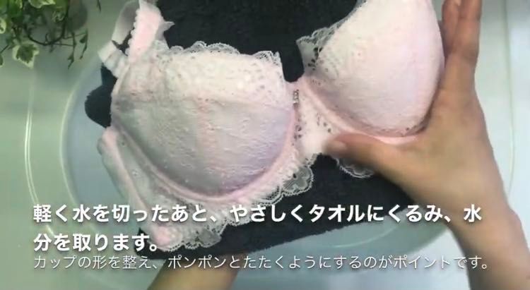 答えはタオルにくるんで数分間置いておくか、アンダーベルトの部分やストラップの部分をはタオルにくるんで、ギューーッと握ると良く水分がとれます。カップはギュッと絞るようなことはせず、押さえる程度にしましょう。