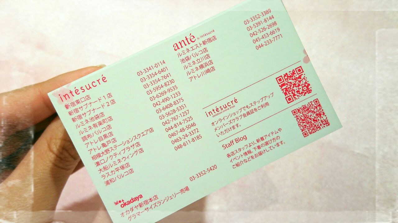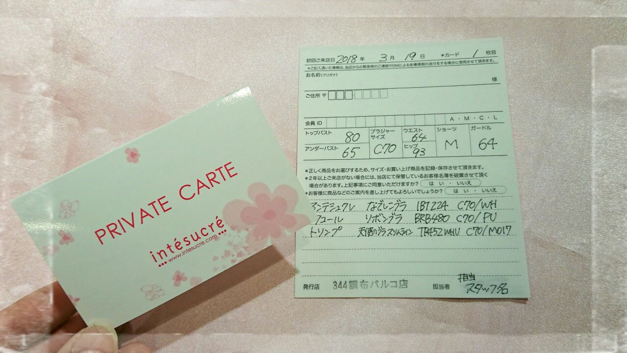 カルテカードにお客様の採寸値、試着後お客様が気に入って下さったブラジャーのメーカー・品番・サイズ・カラーなど記入してお渡し致します!