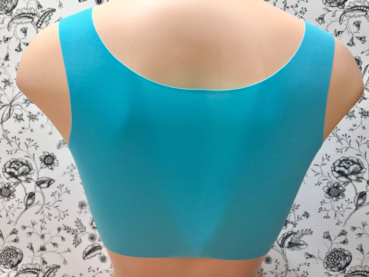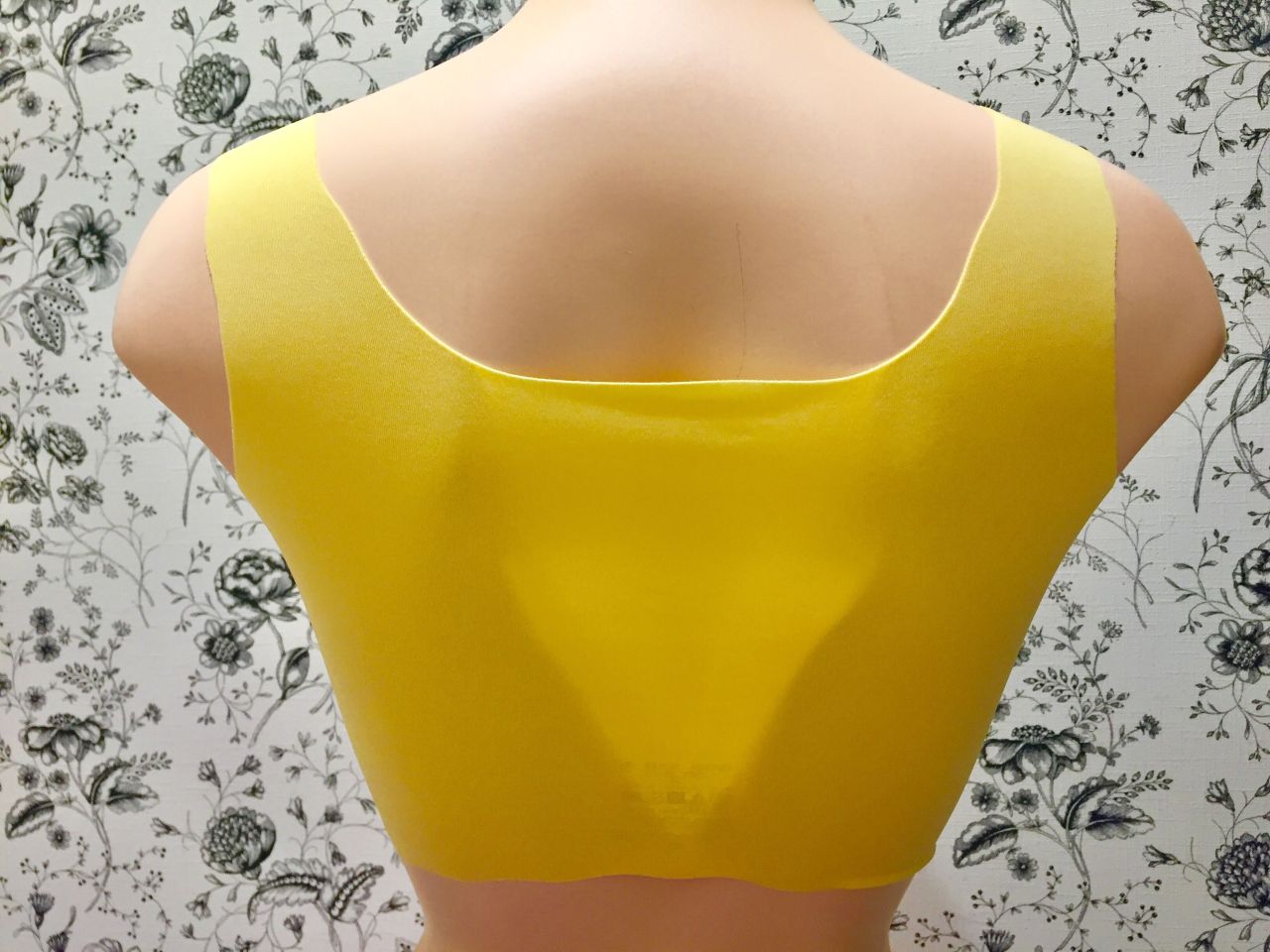 襟ぐりや袖ぐり裾にも断ち切りのヘム仕様=縫い目無しなので、テープの食い込みもほとんどなく、体の動きに合わせてブラジャーも一緒に伸縮します。皮膚の動きに合わせて一緒に伸びるので、肌との一体感があるのです。