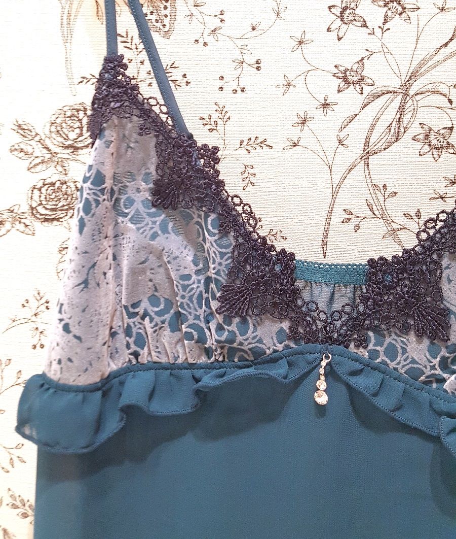 スリップの胸元にもケミカルレースとチャームをゆらして、豪華に仕上げています。