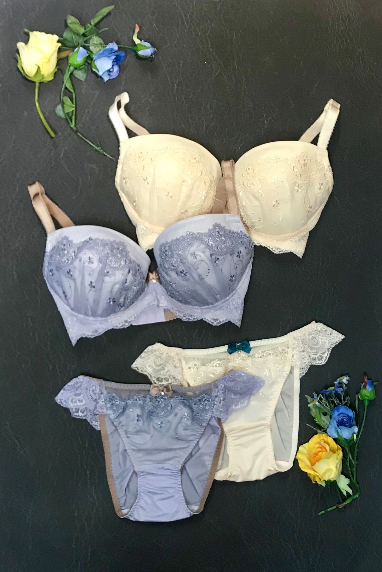 ミルキーなアイボリーとくすみブルーカラーに、繊細ななレース使いがロマンティック♫
