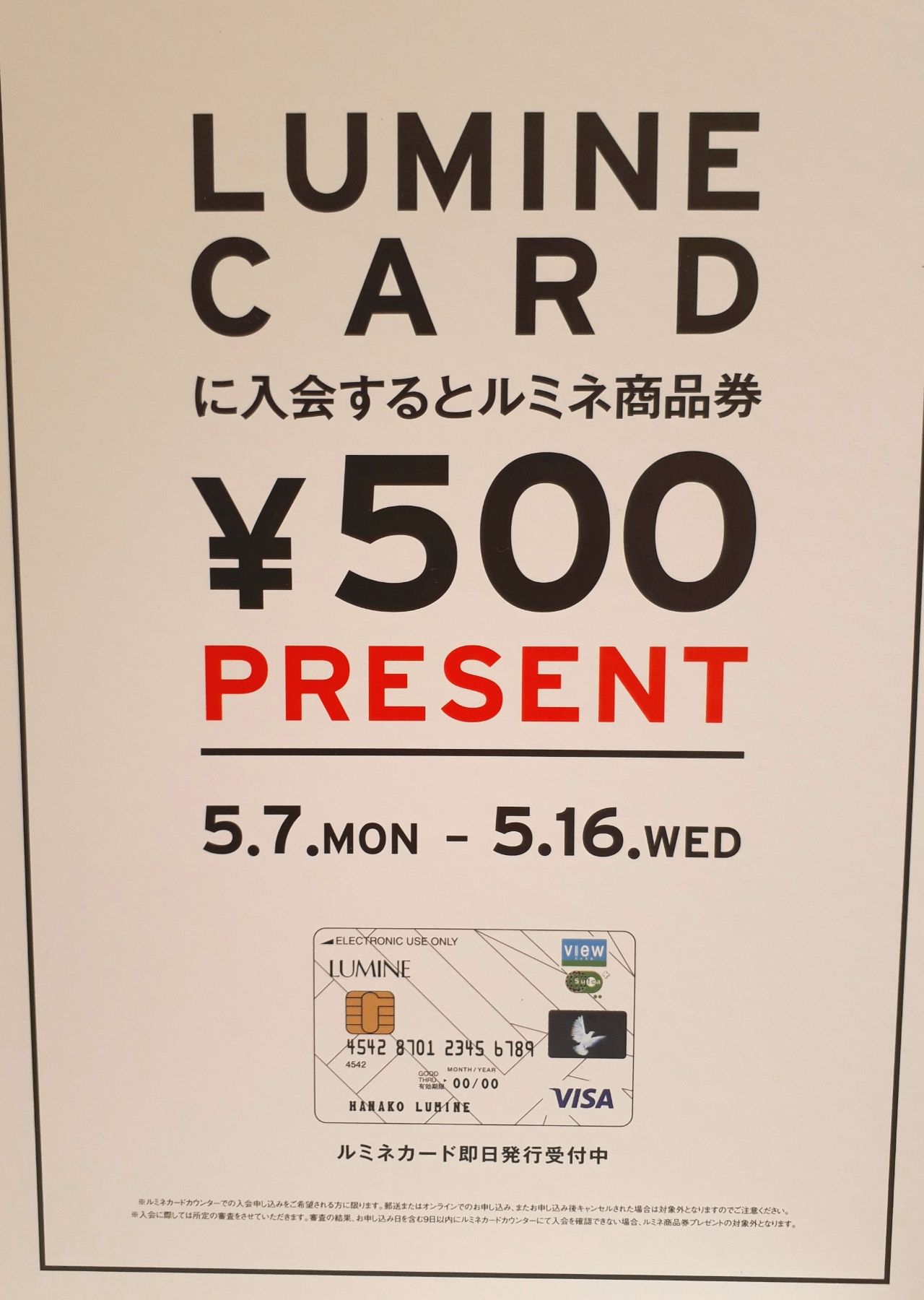 ルミネカードを新規でご入会頂くと、ルミネ商品券500円分を貰えるキャンペーンを5/16まで実施しております(^ω^)♪