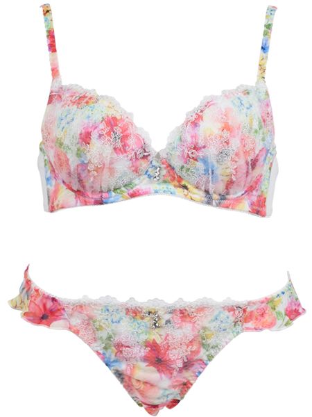 ポイントは7色の花園をイメージしたキュートなプリントと、エレガントなレース使い、