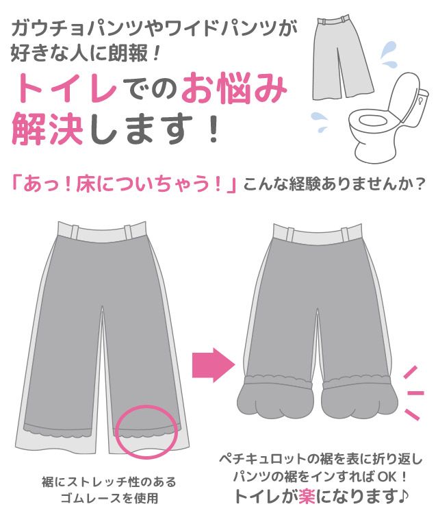 皆さんはガウチョパンツやワイドパンツがトイレで床についてしまって、ストレスを感じた経験ってありませんか?