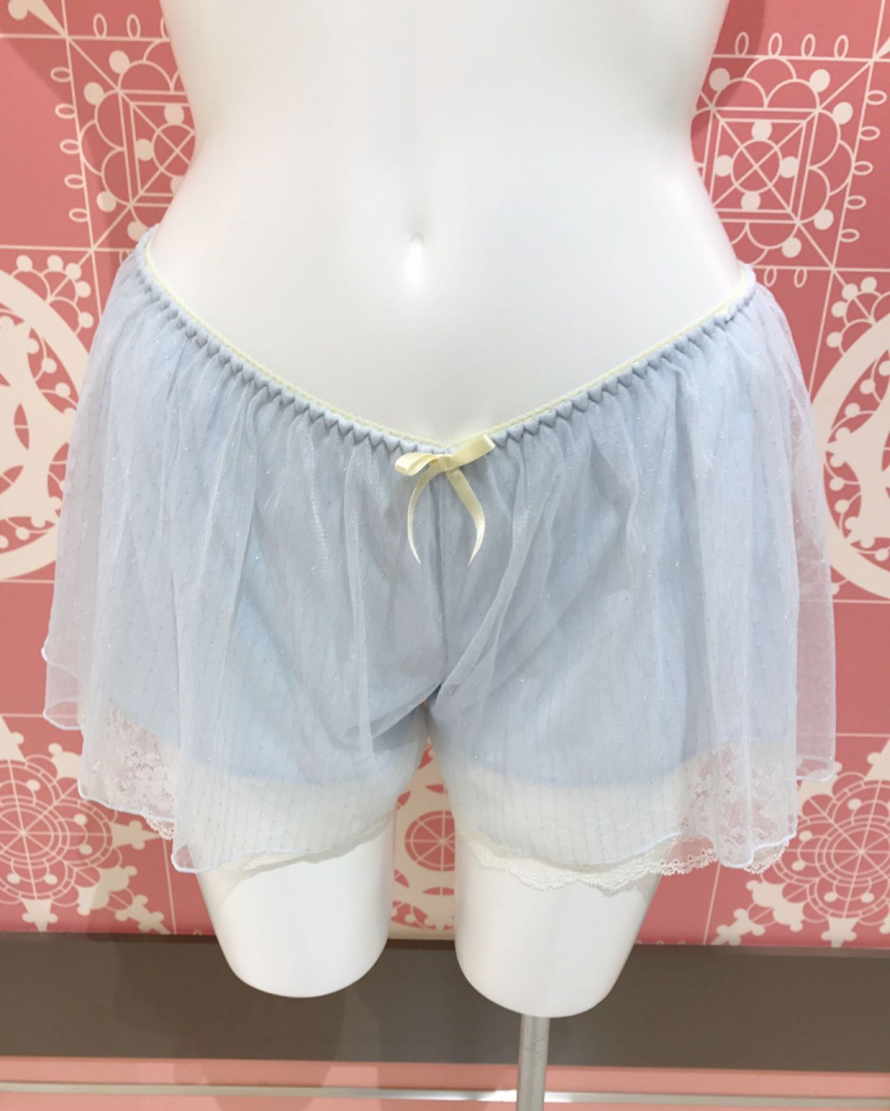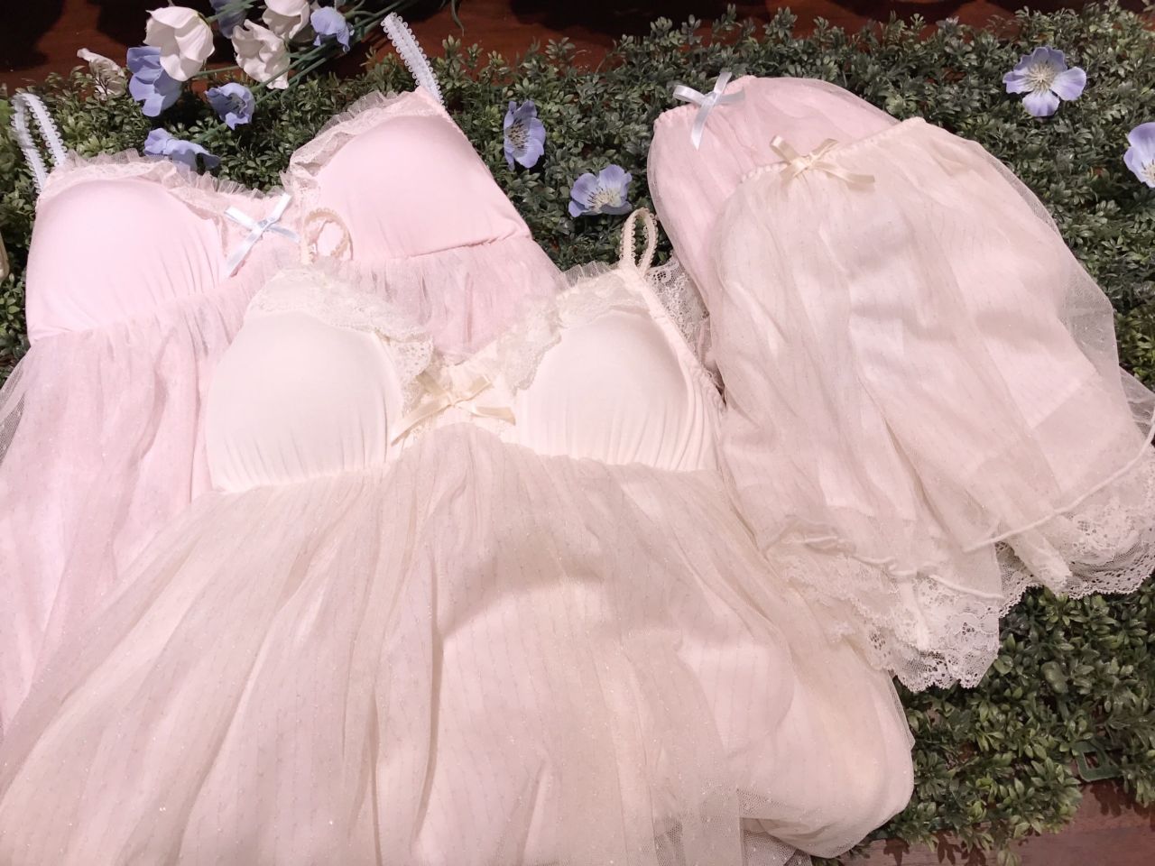 柔らかい素材でふんわり優しいイメージのデザイン♡ラメのストライプの刺繍が入ったチュールレースが可愛らしい(*^^*)