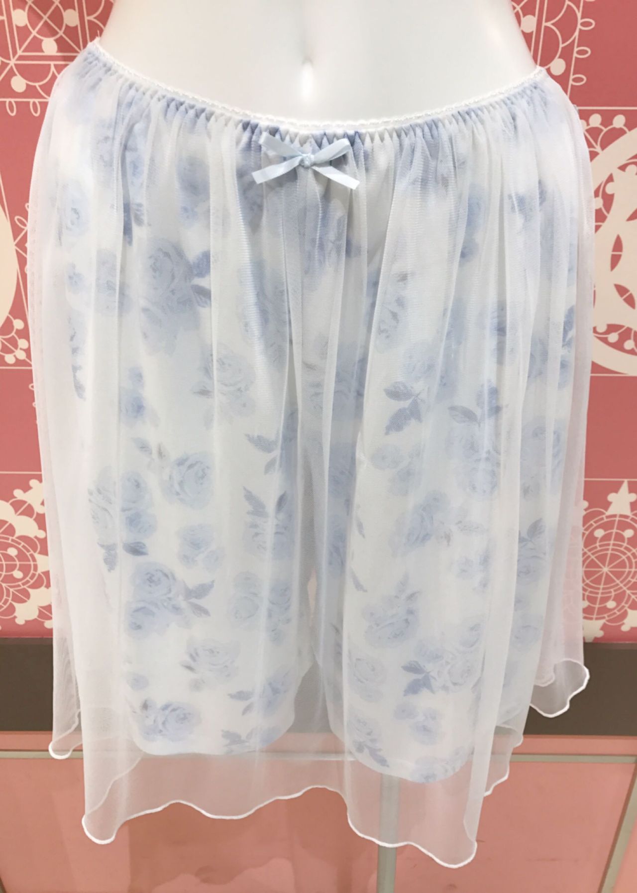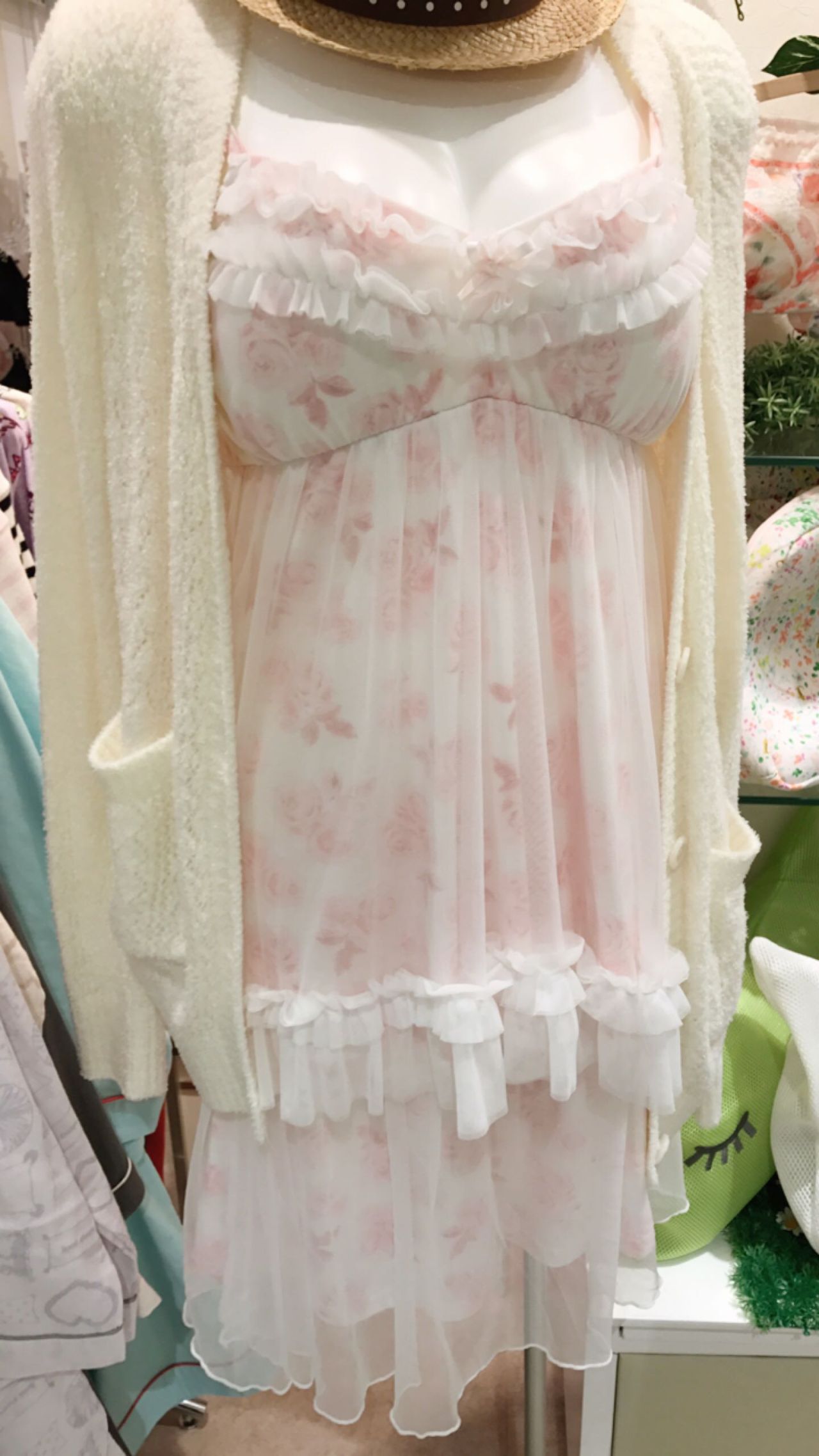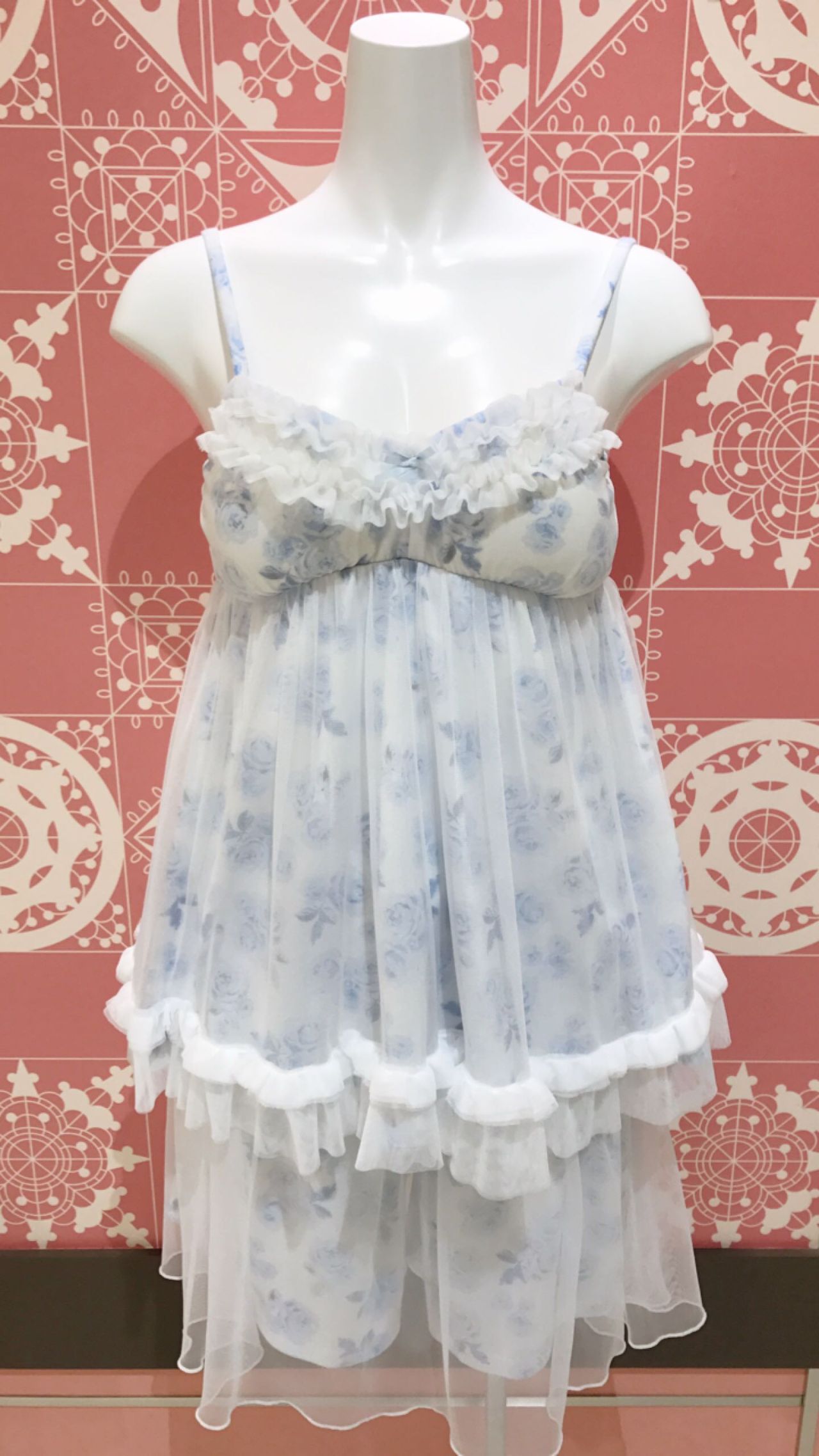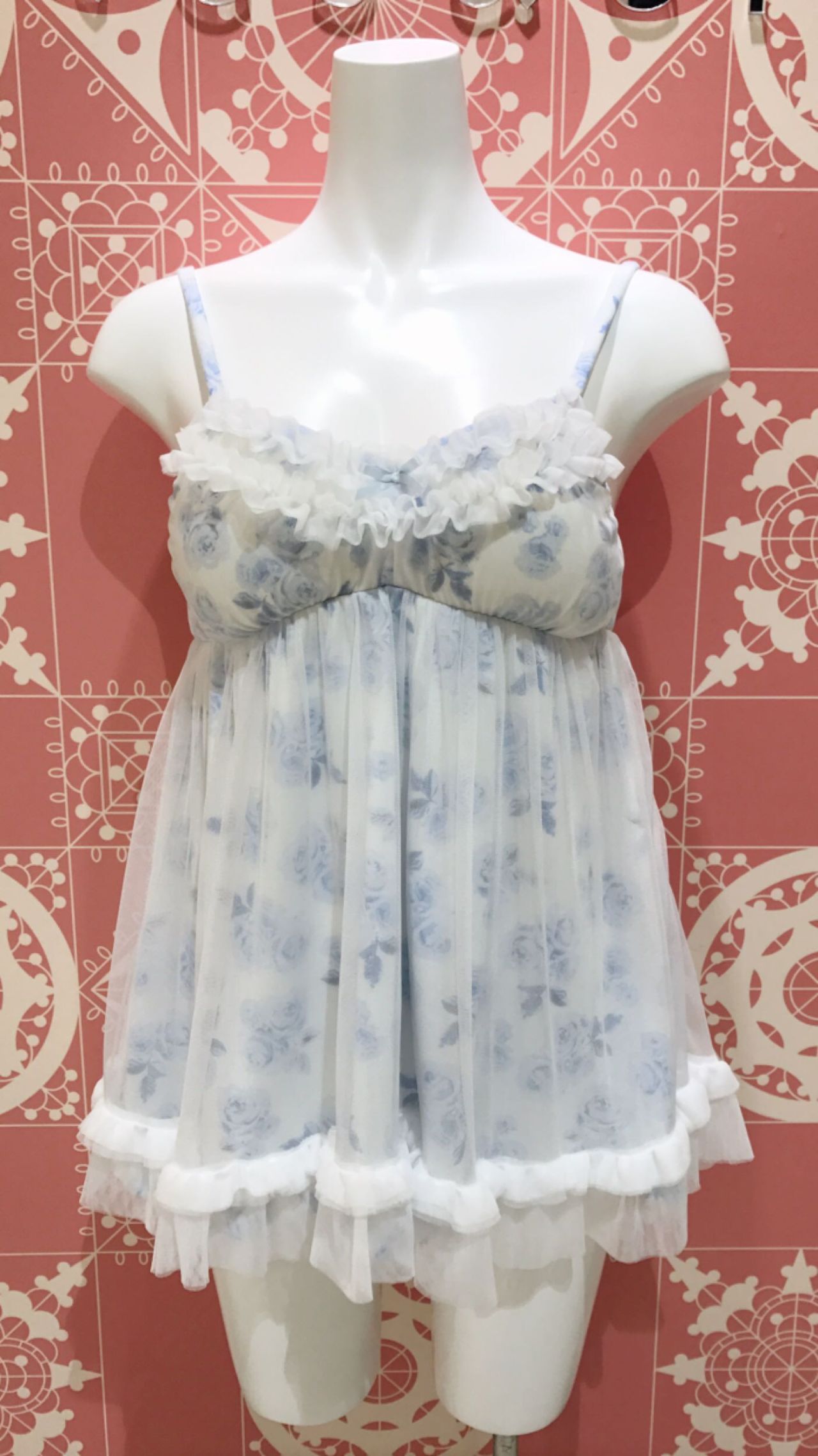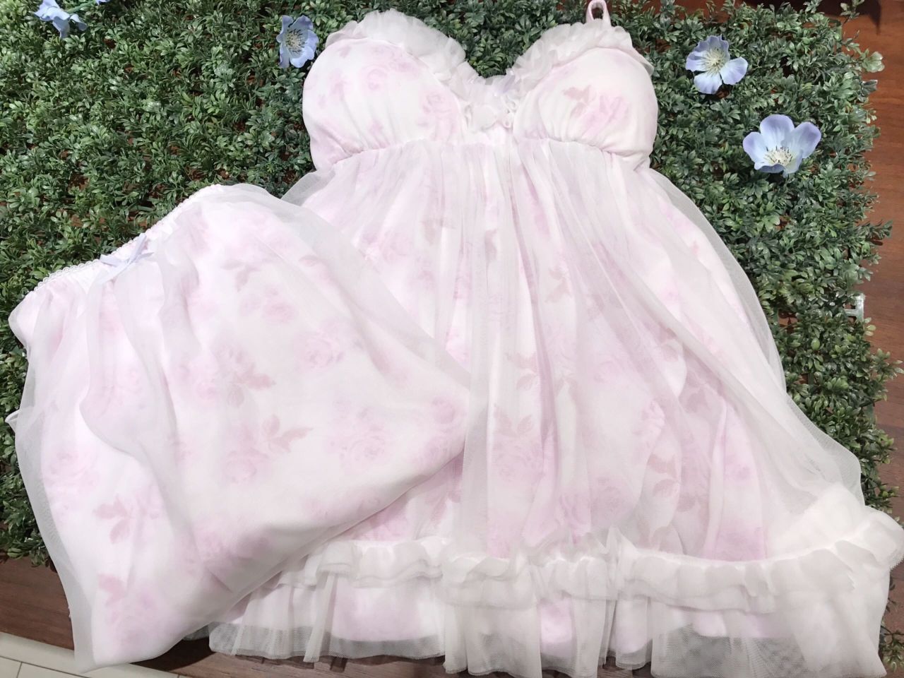 全体がバラのプリント柄で上からチュールレースを重ねたふんわりキュートなデザイン♡胸元と裾にもふんだんにレースを重ねて可愛らしさアップ(о´∀`о)♡