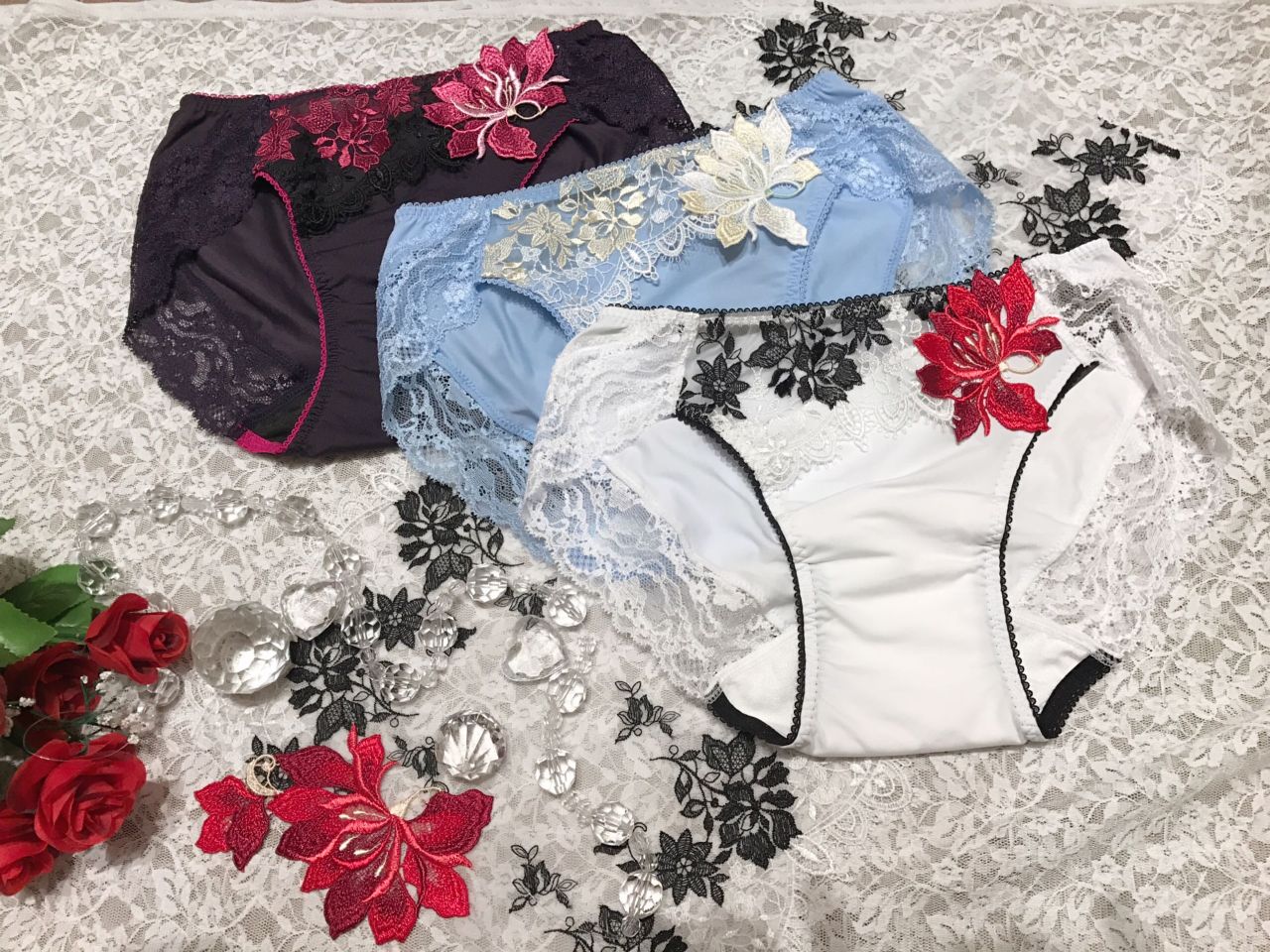 華麗なロココ様式の宮殿で、優雅なドレスをまとう王妃をイメージ(*´ω`*)艶やかなケミカルレースとカップサイドのお花アップリケが魅力的なデザイン☆
