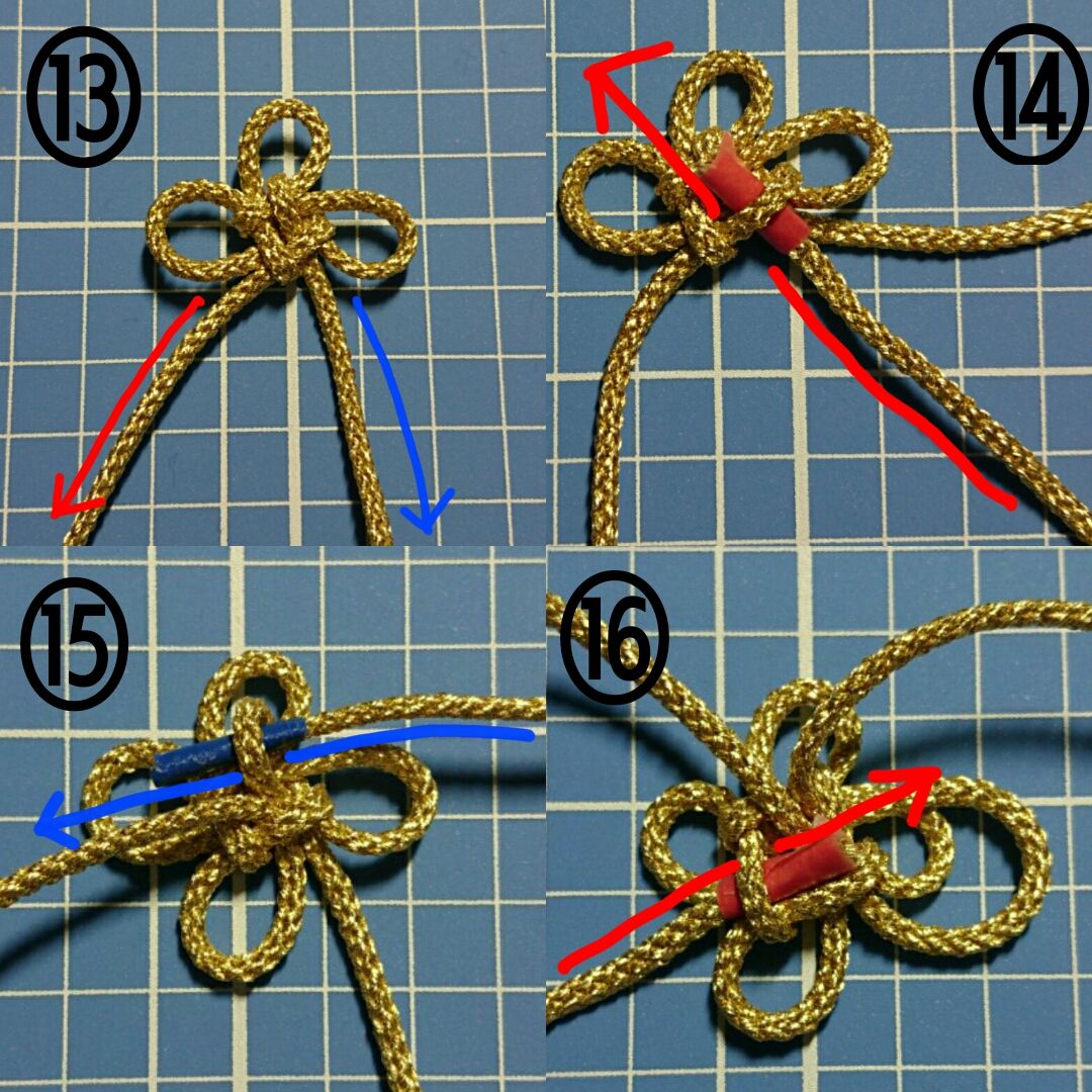 ①結び方が複雑なため、2つに折った状態で上のコードを赤コード、下のコードを青コードと呼びます。それぞれの色の矢印は進行方向を表しています。