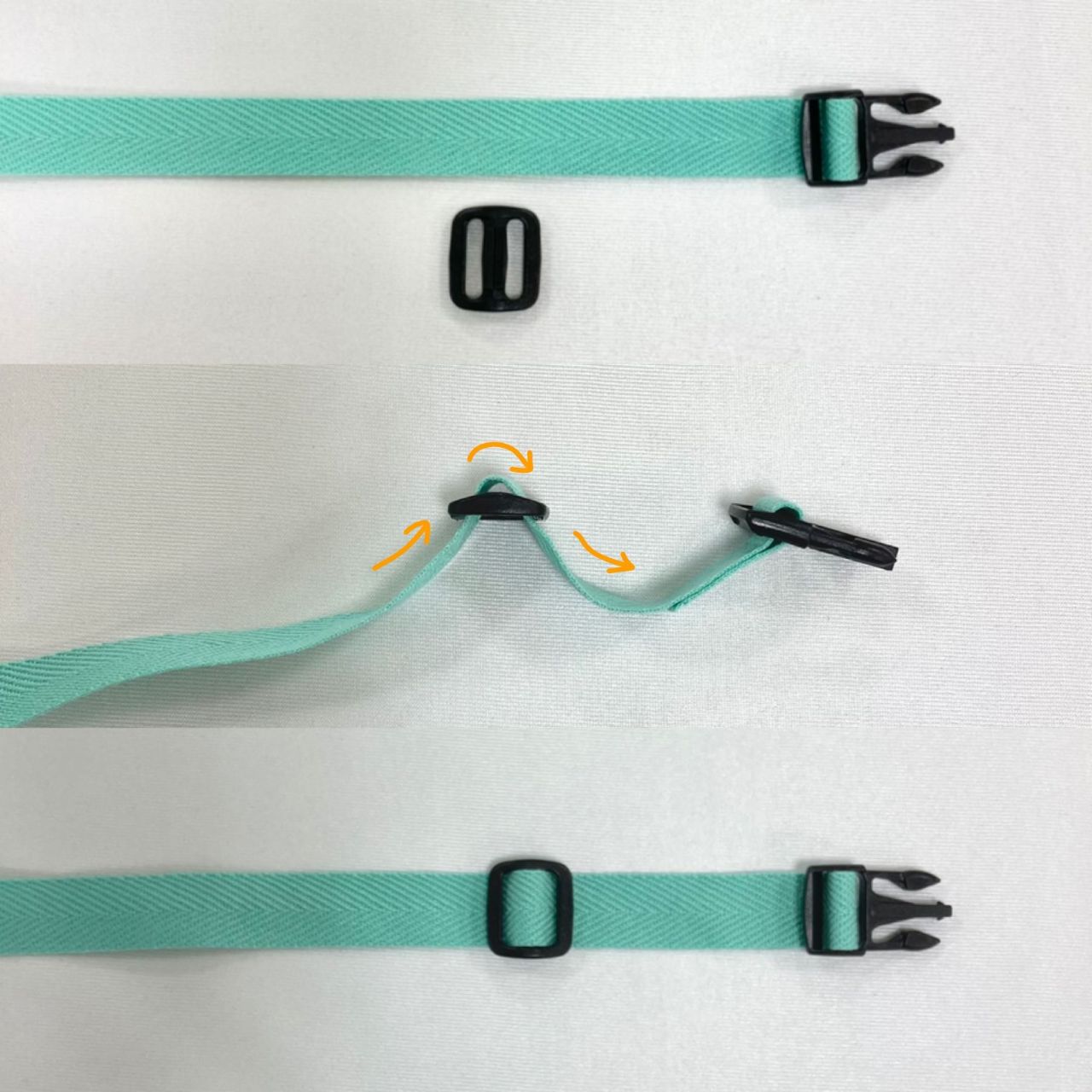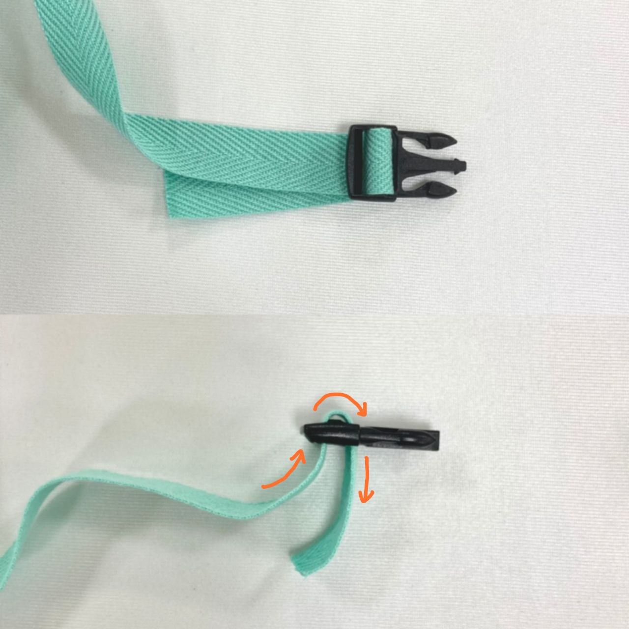 この時、バックル側の隙間には通さず、肩紐側にだけ通します。