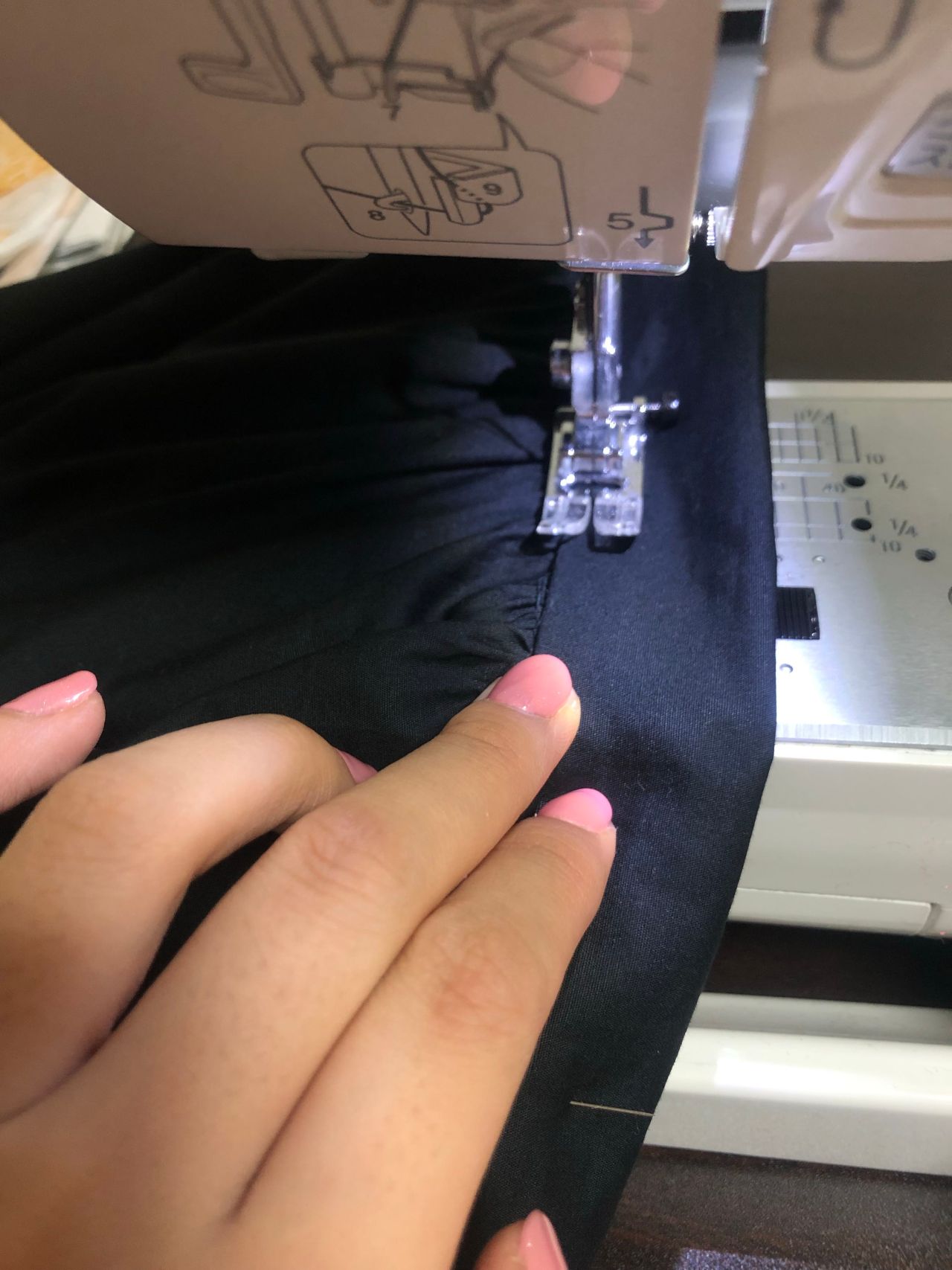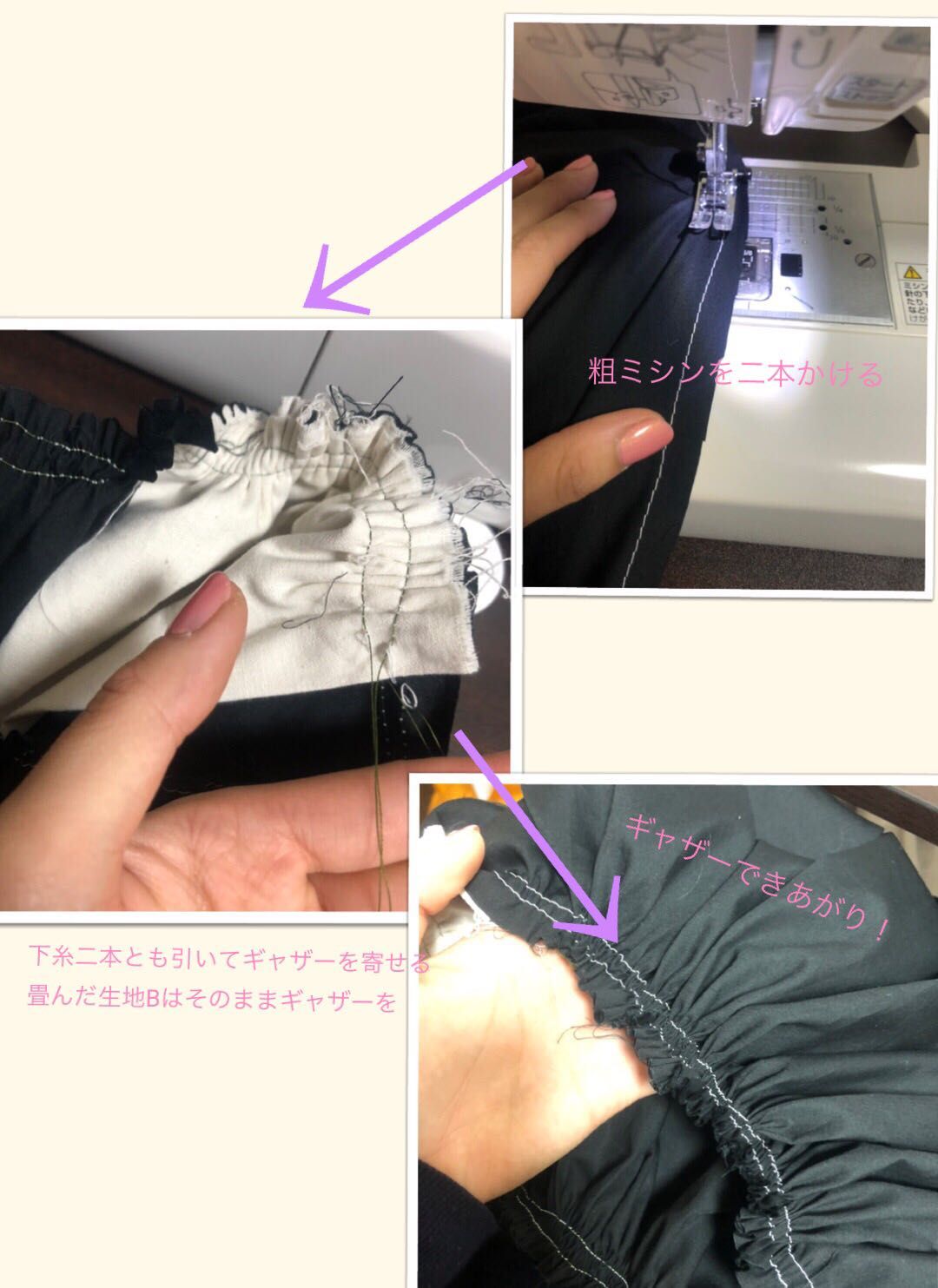⑤ウエストにギャザーを寄せる。④で畳んだ所は畳んだままギャザーを寄せる。