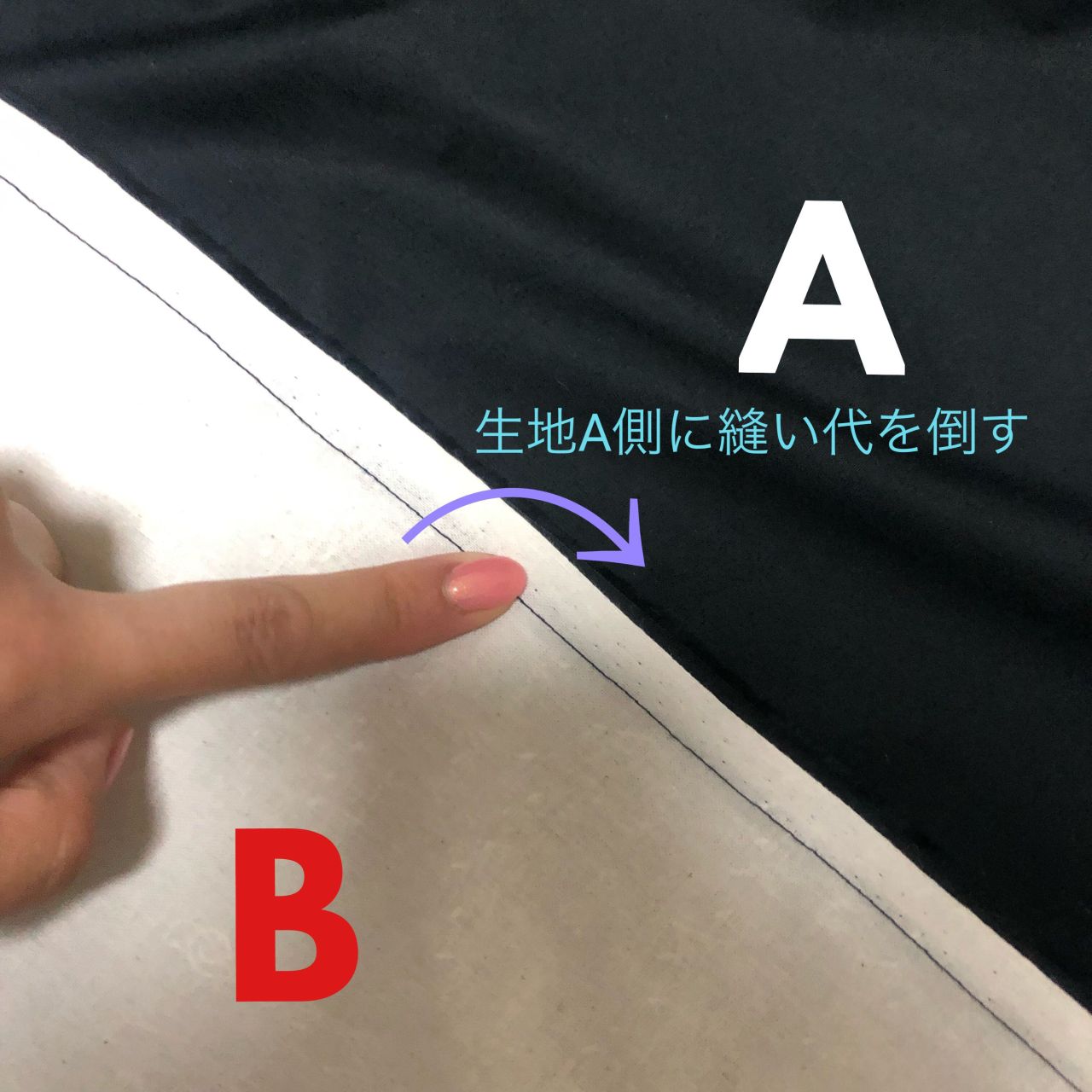 ③縫い代を生地A側に倒してアイロンをしておく。