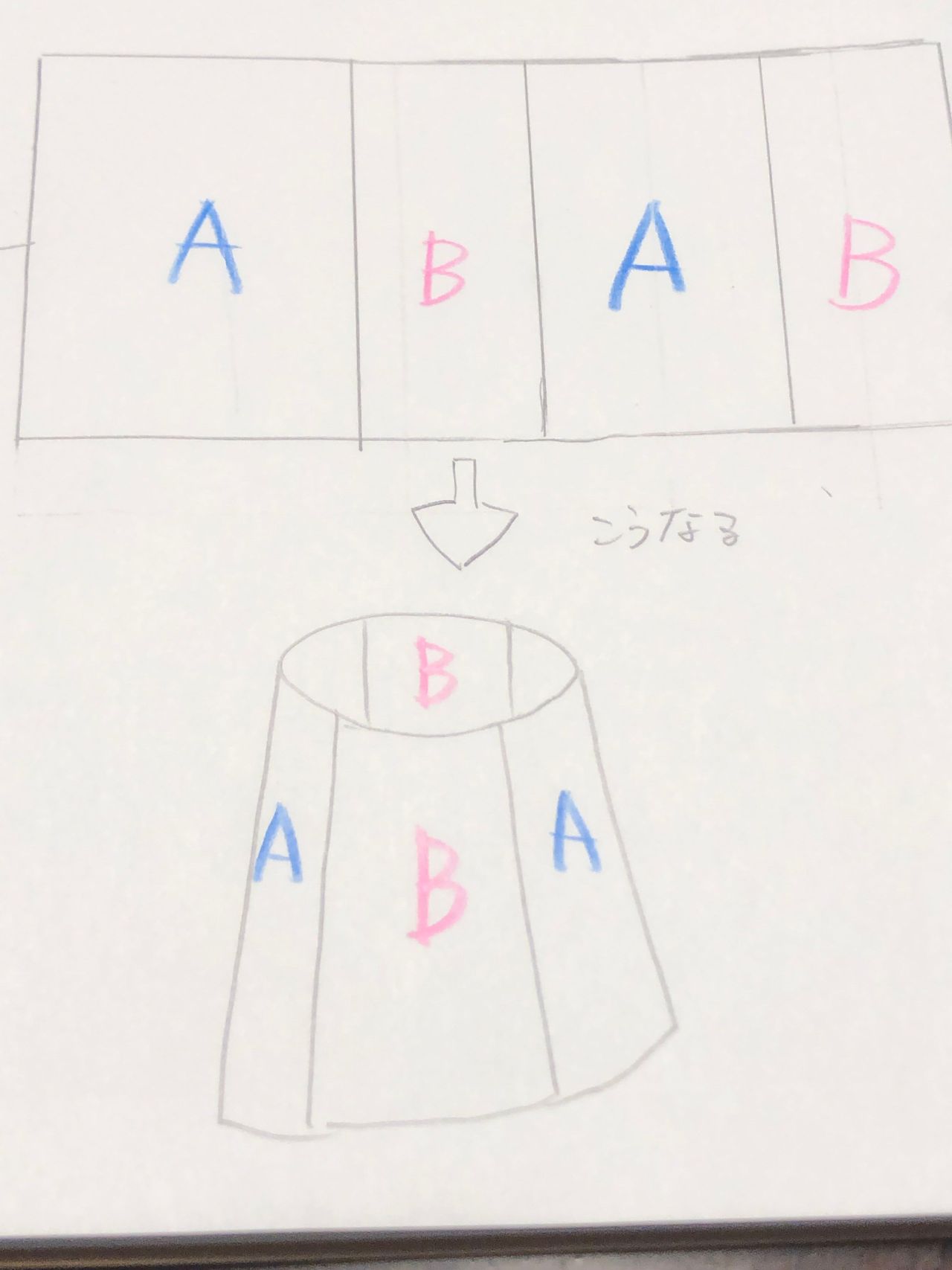 ②生地AとBを交互に縫い合わせる。